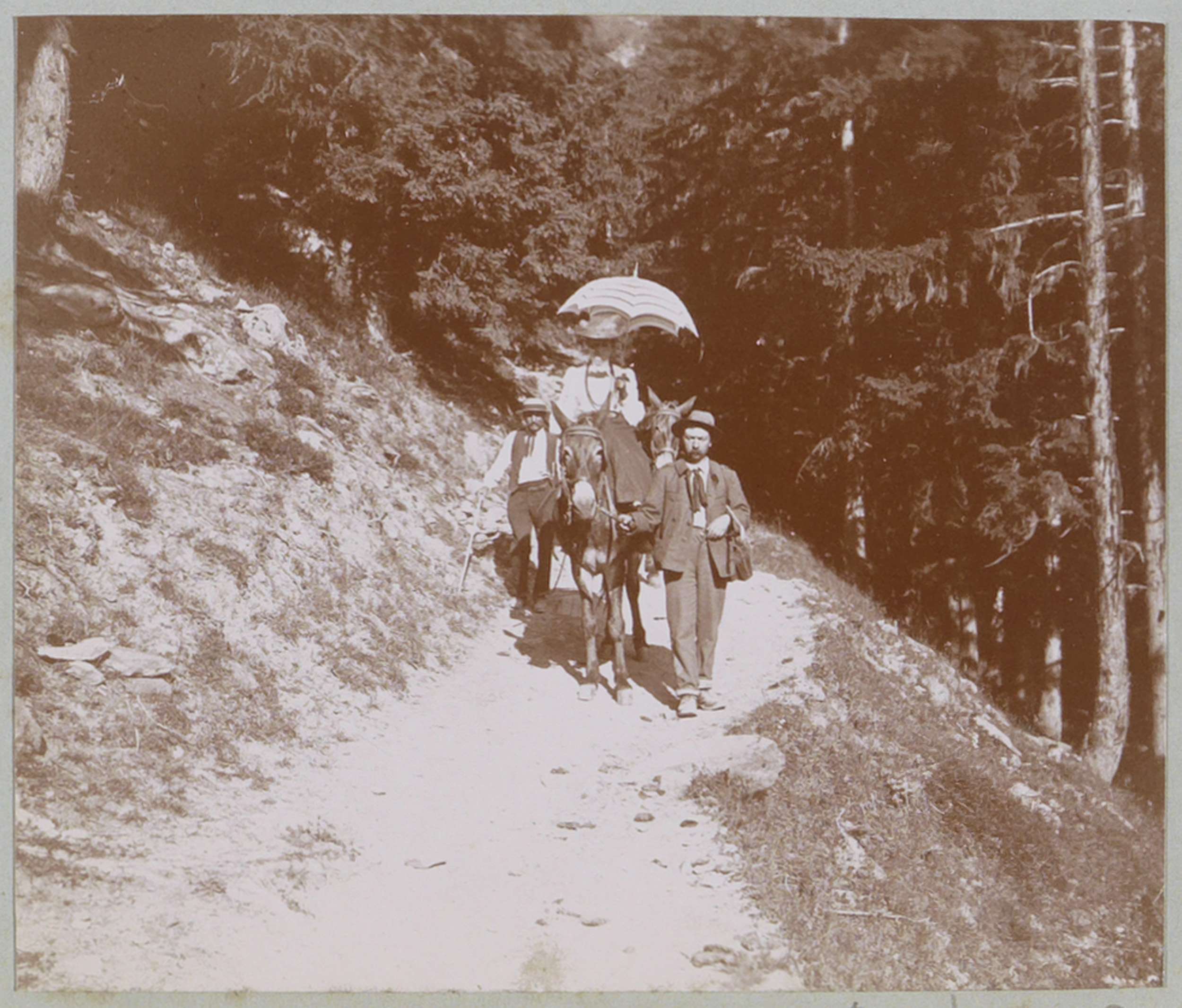 Vrouw op een ezel en twee mannen op een bergpad in d...