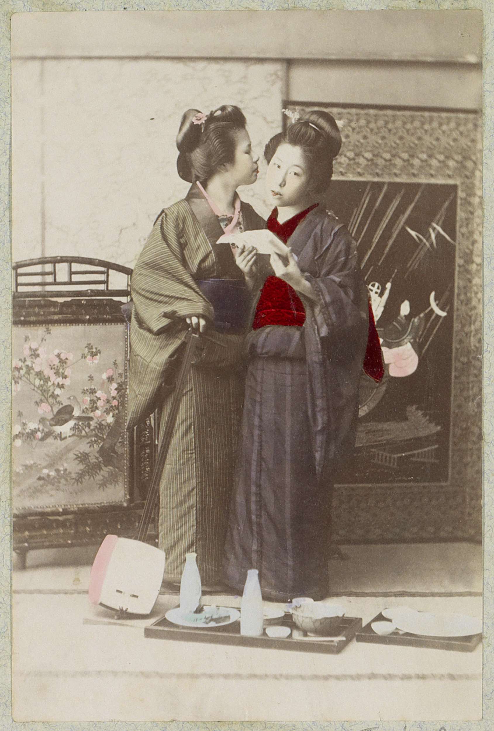 Portret van twee Japanse vrouwen, met kamerschermen ...
