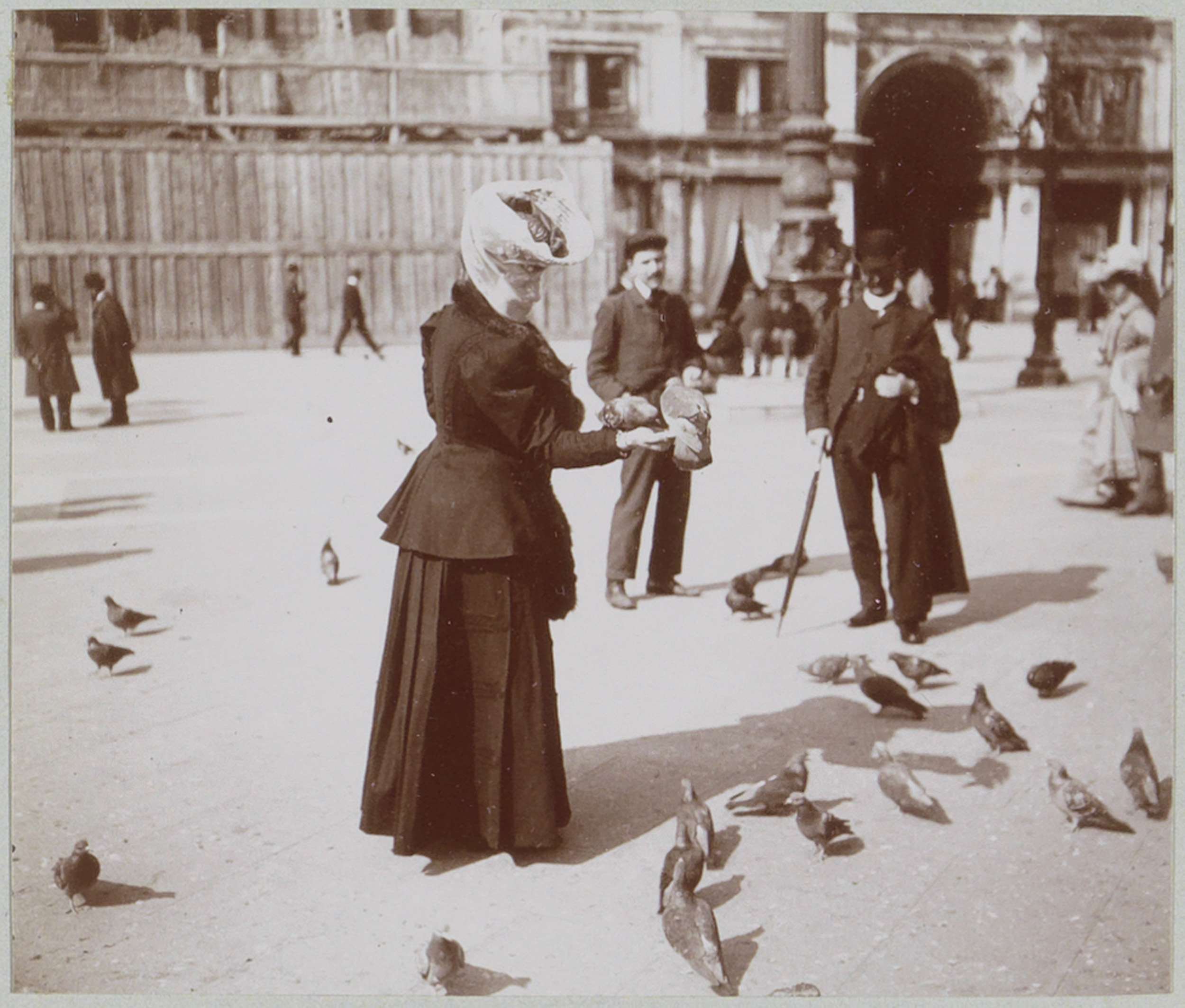 Vrouw voert duiven op het San Marcoplein in Venetië