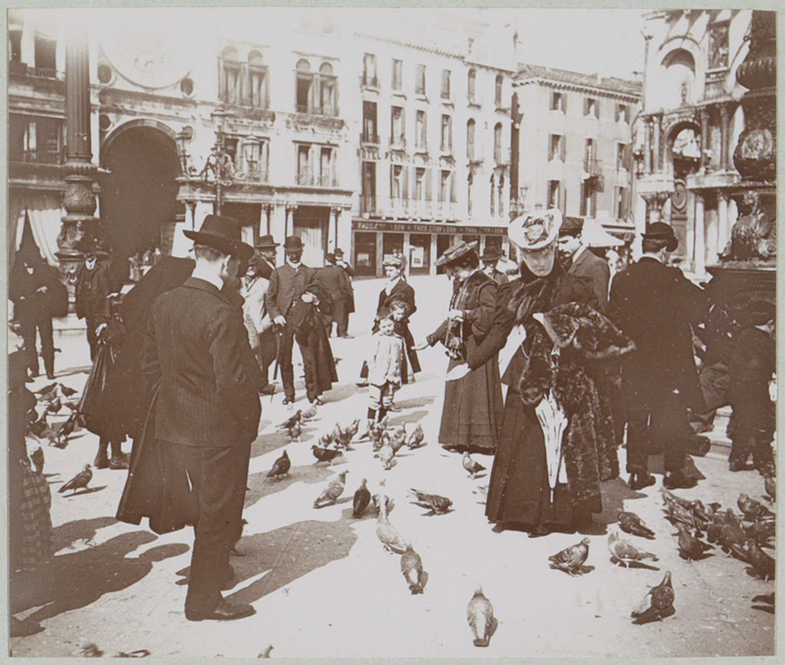 Vrouwen en kinderen voeren duiven op het San Marcopl...