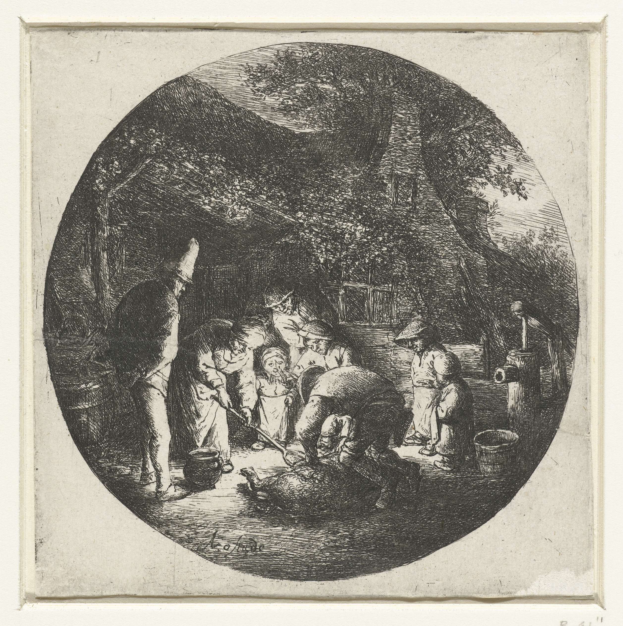 Boerenfamilie bij het slachten van een varken