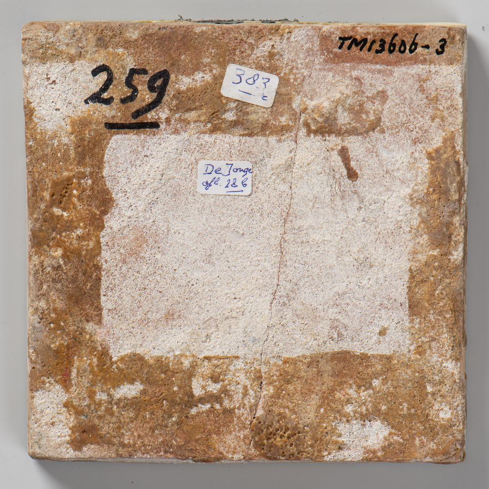 Tegel van keramiek met tinglazuur, voorstellende: De...