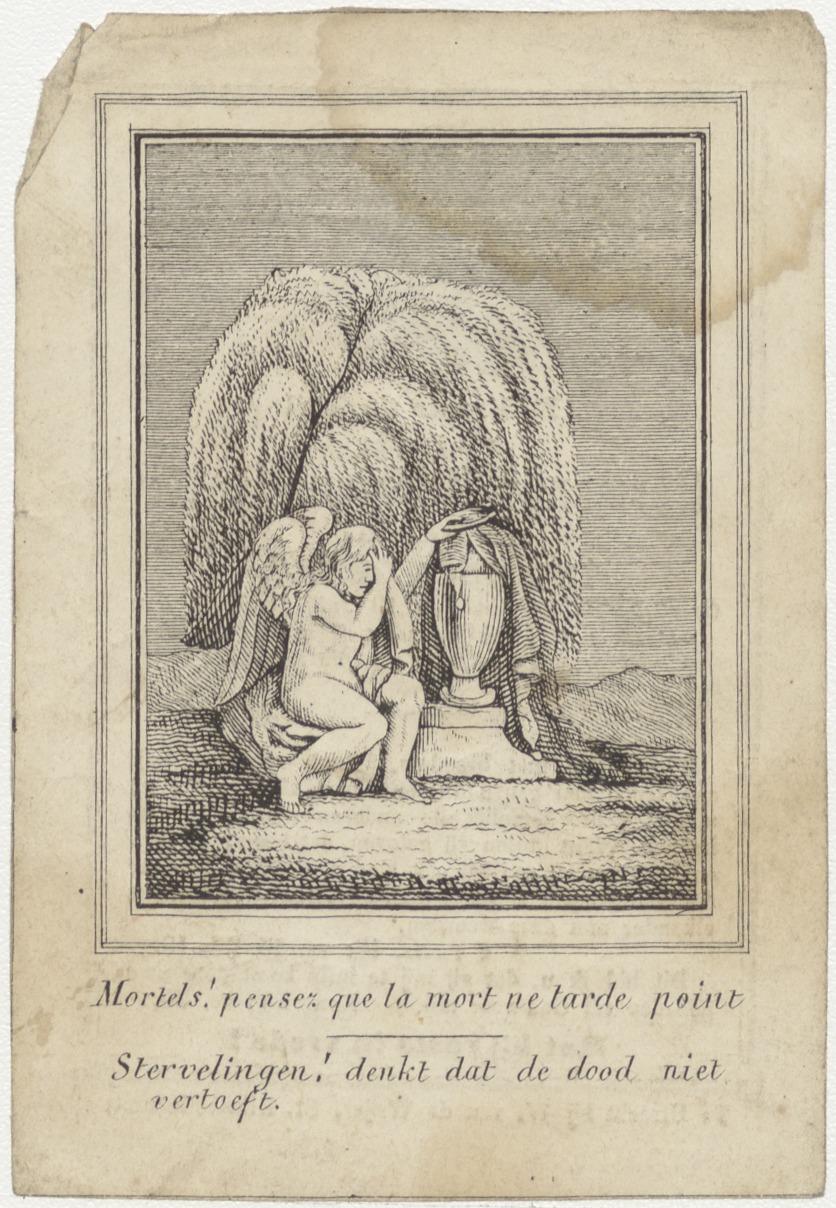 Man met twee engelen voor altaar, kz. Bid voor ziel ...