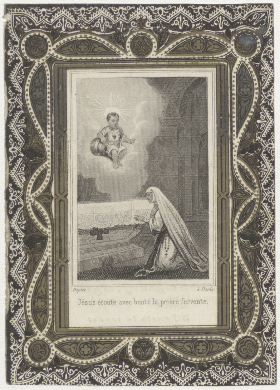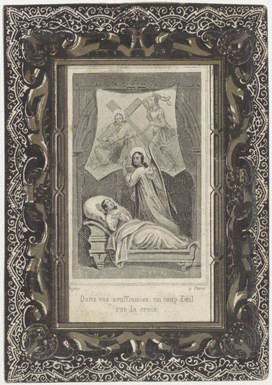 Christuskind aan het kruis (Frans), kz. Bid voor zie...