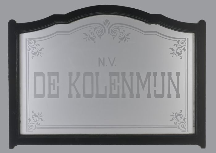 Raam met gegraveerd opschrift "N.V. / DE KOLENMIJN"