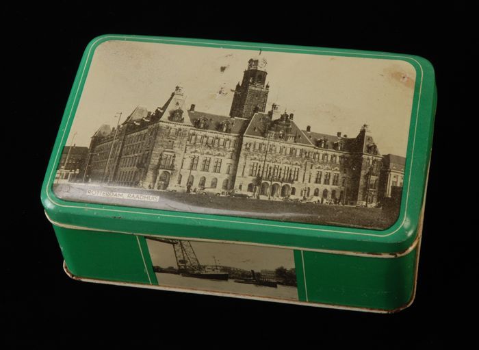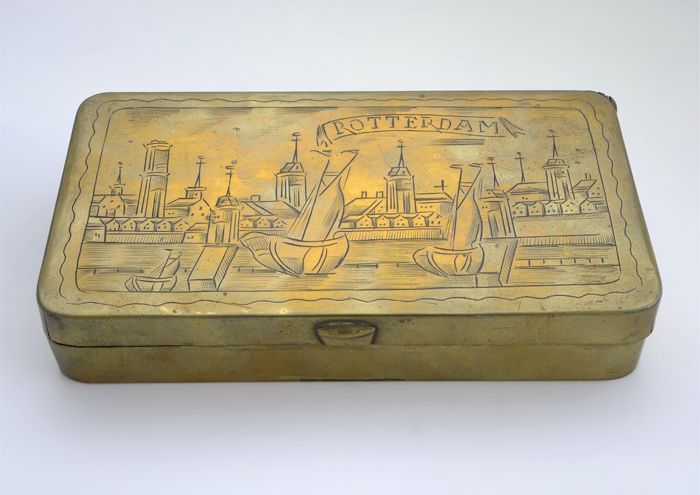 Koperen tabaksdoos met gezicht op Rotterdam