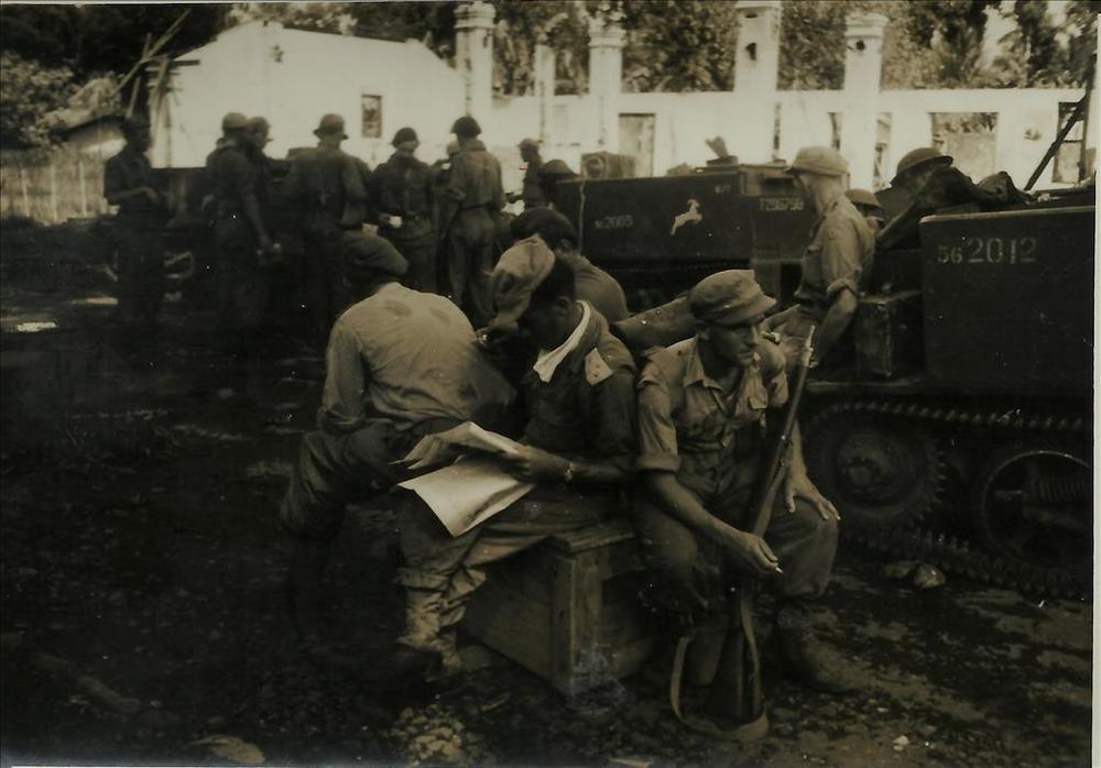 Nederlands Indië; militairen rustpauze rupsvoertuig ...