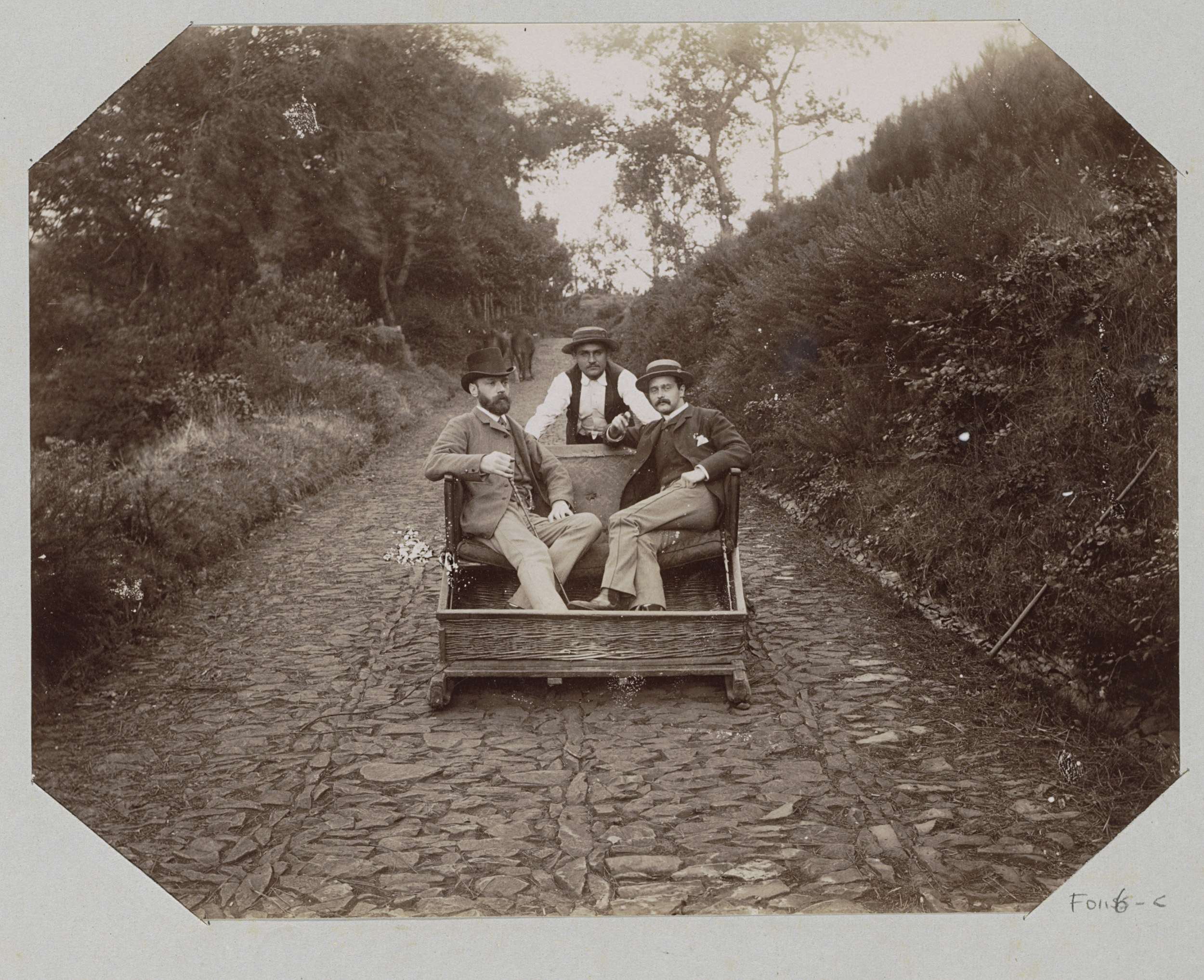 Twee mannen in toeslede op een helling te Madeira