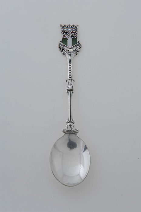 Geëmailleerde theelepel met wapen Rotterdam en "Ria"...