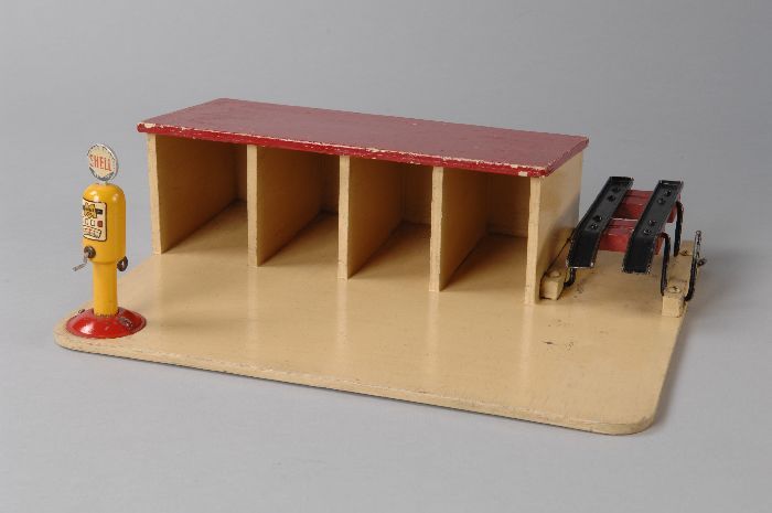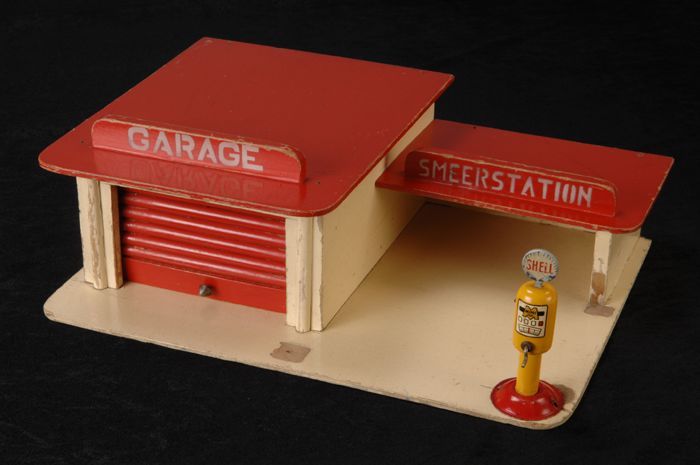 Houten garage met smeerstation en losse benzinepomp ...