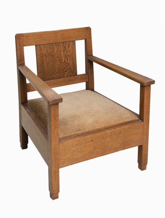 Eikenhouten lage armstoel met beige ribfluwelen bekl...