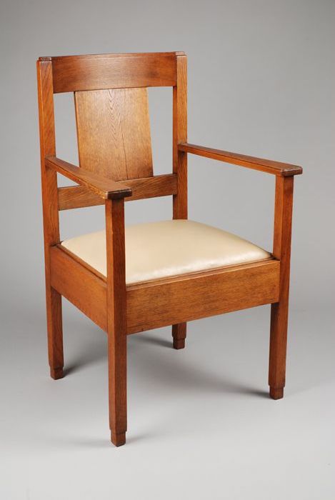 Eikenhouten hoge armstoel met nieuwe beige kunstleer...