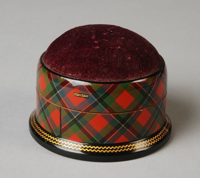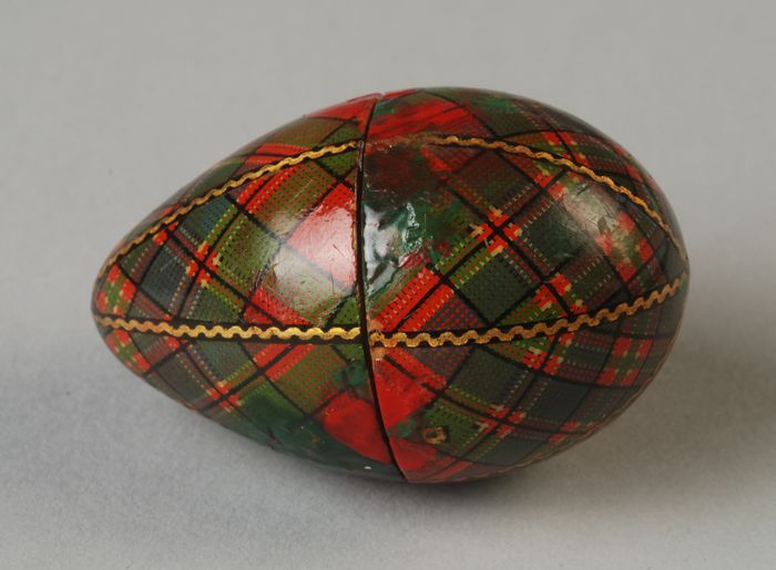 Houten ei met schotse ruit beplakt, daarin een naald...