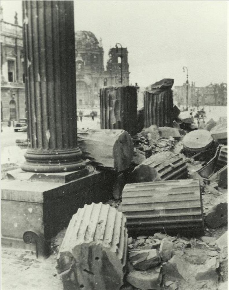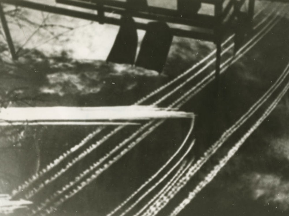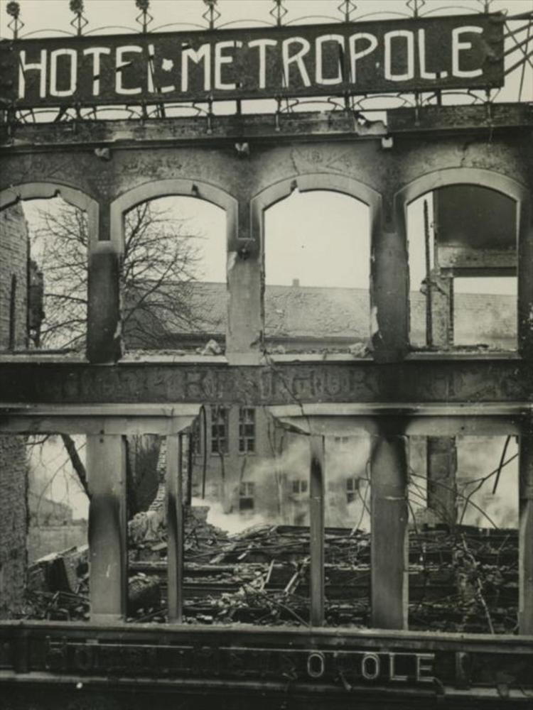 opgeblazen spoorbrug te Nijmegen, gezien vanaf Waalkade
