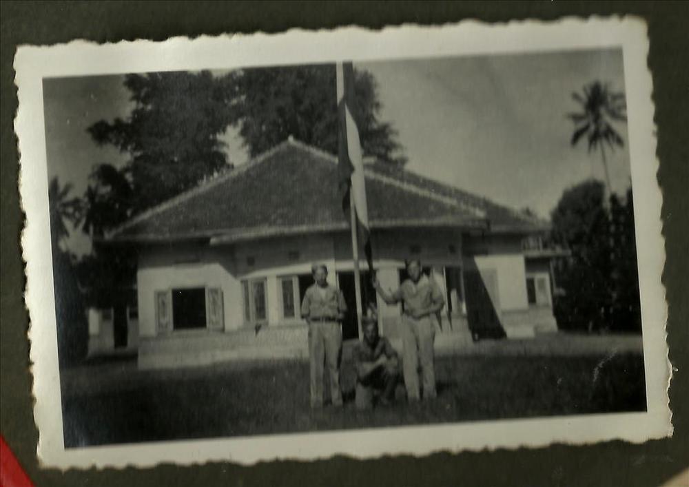 Nederlands Indië; drie militairen, huis, vlaggemast