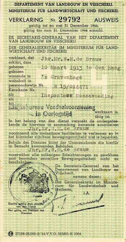 legitimatiebewijs op naam van Jhr mr de Brauw, afgeg...