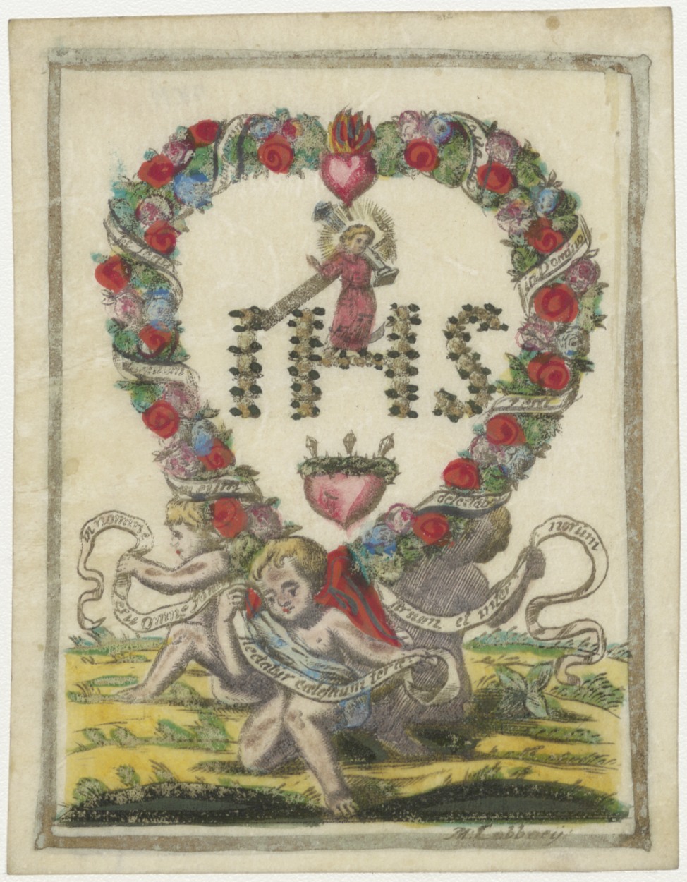 IHS, Christus in hart van bloemen, ingekleurd