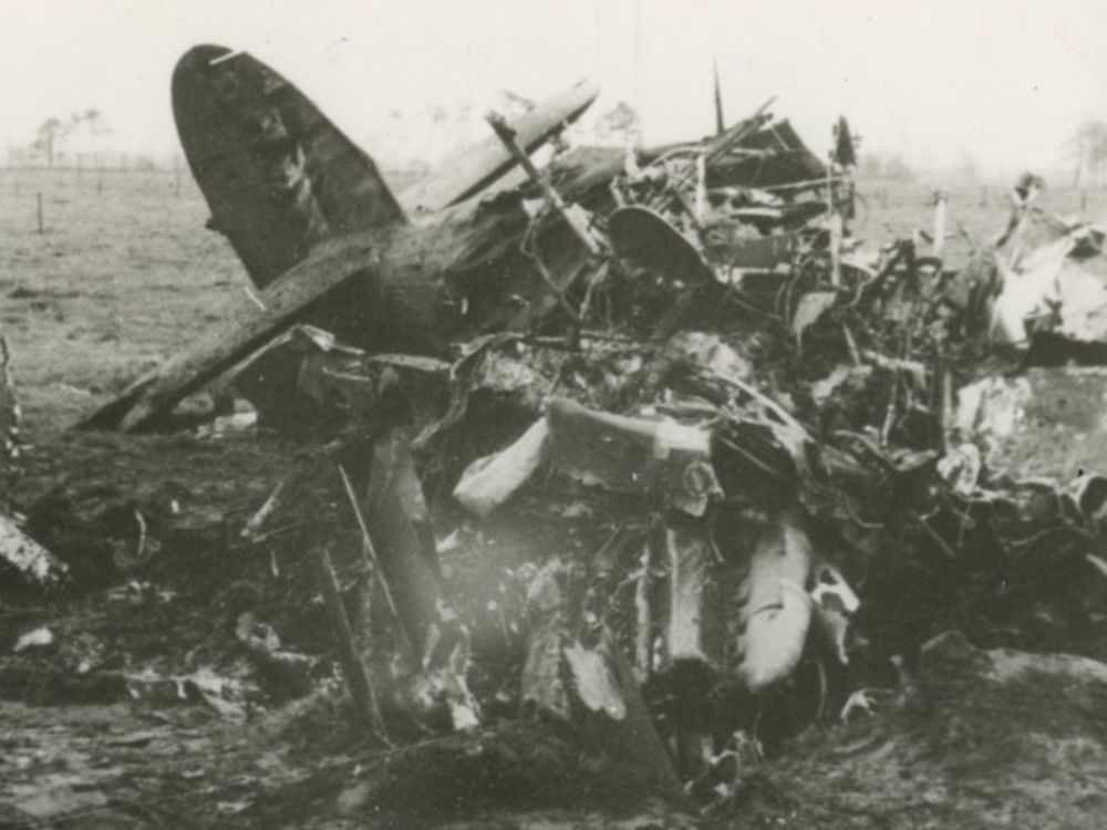 Foto van wrak van Hawker Hurricane in een veld. Teks...