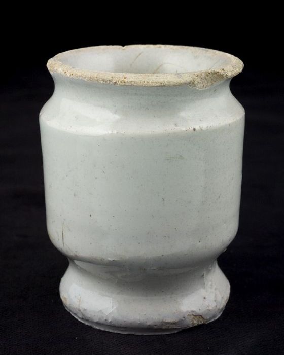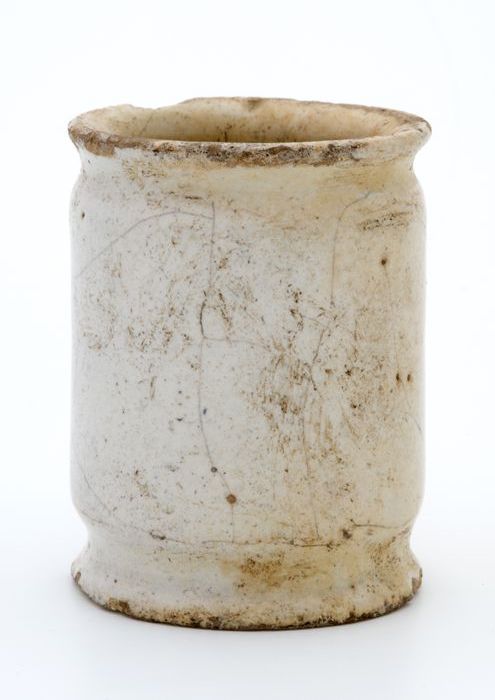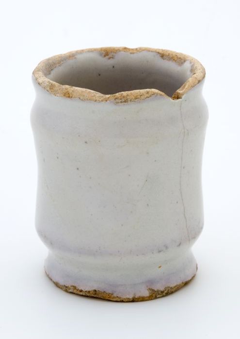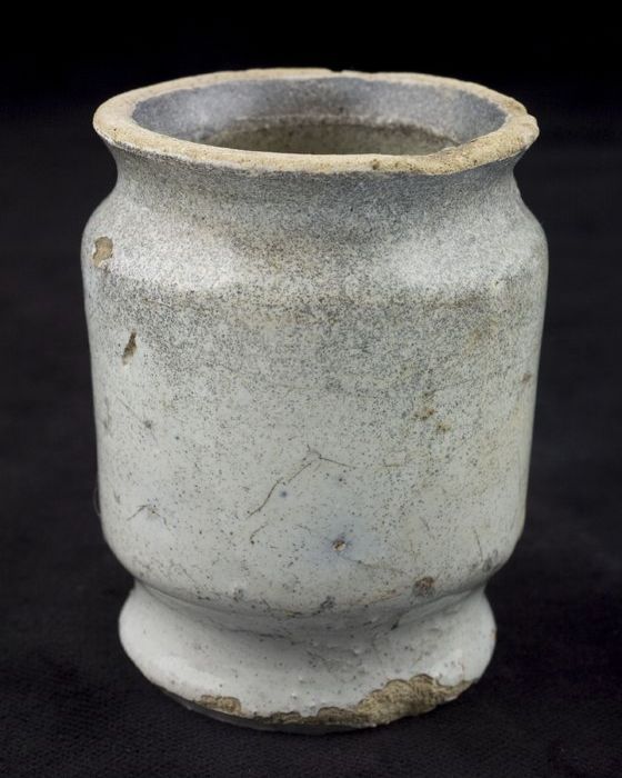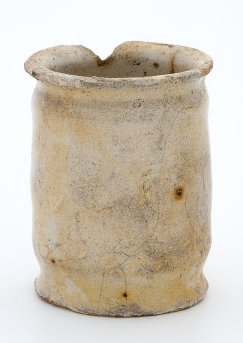 Aardewerk zalfpot, cilindrisch op standvoet, met twe...