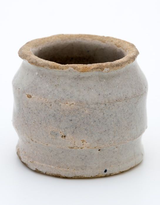 Aardewerk zalfpot, taps van vorm, met twee insnoerin...