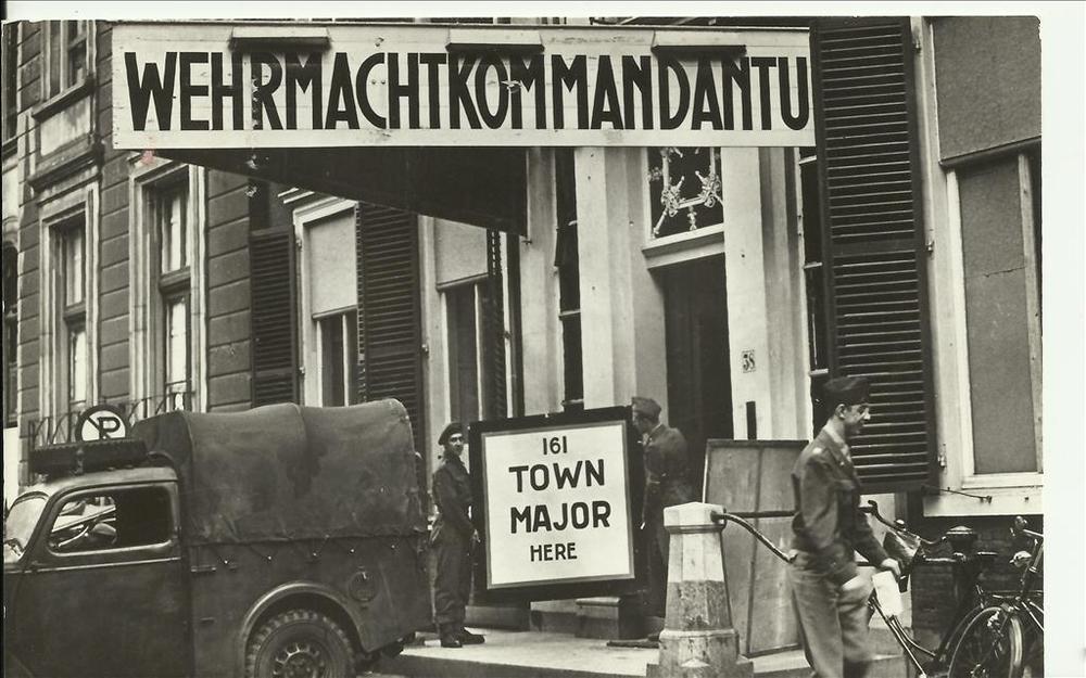 Bord 'Town major Here' wordt gezet buiten Wehrmachtk...