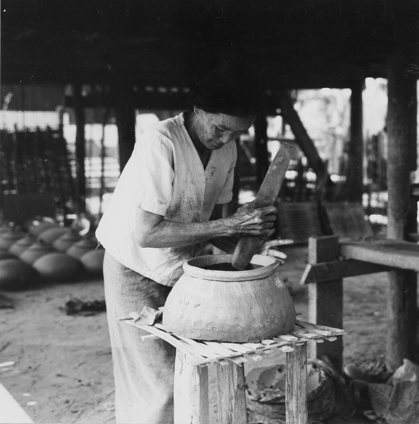 Met een zware houten spatel wordt de buitenwand van ...
