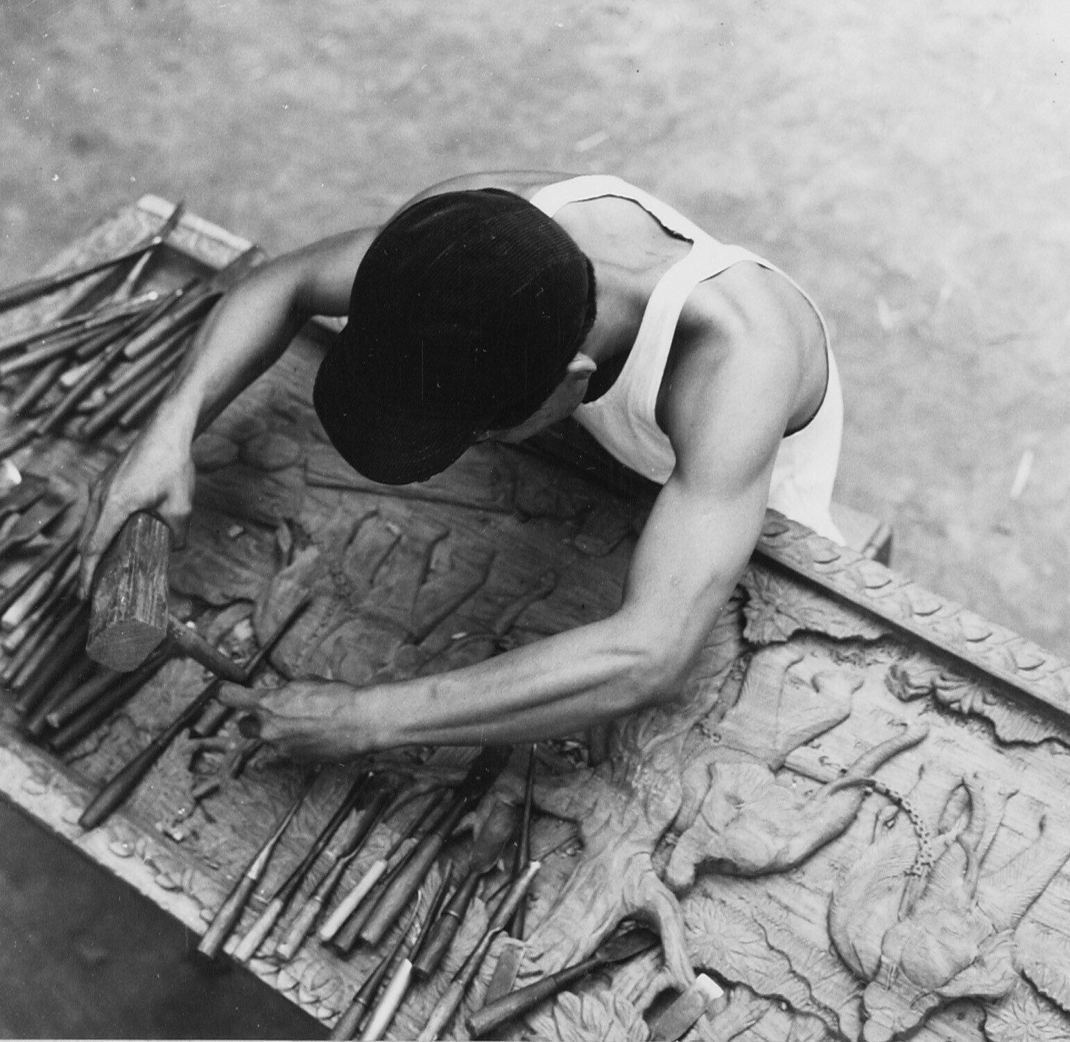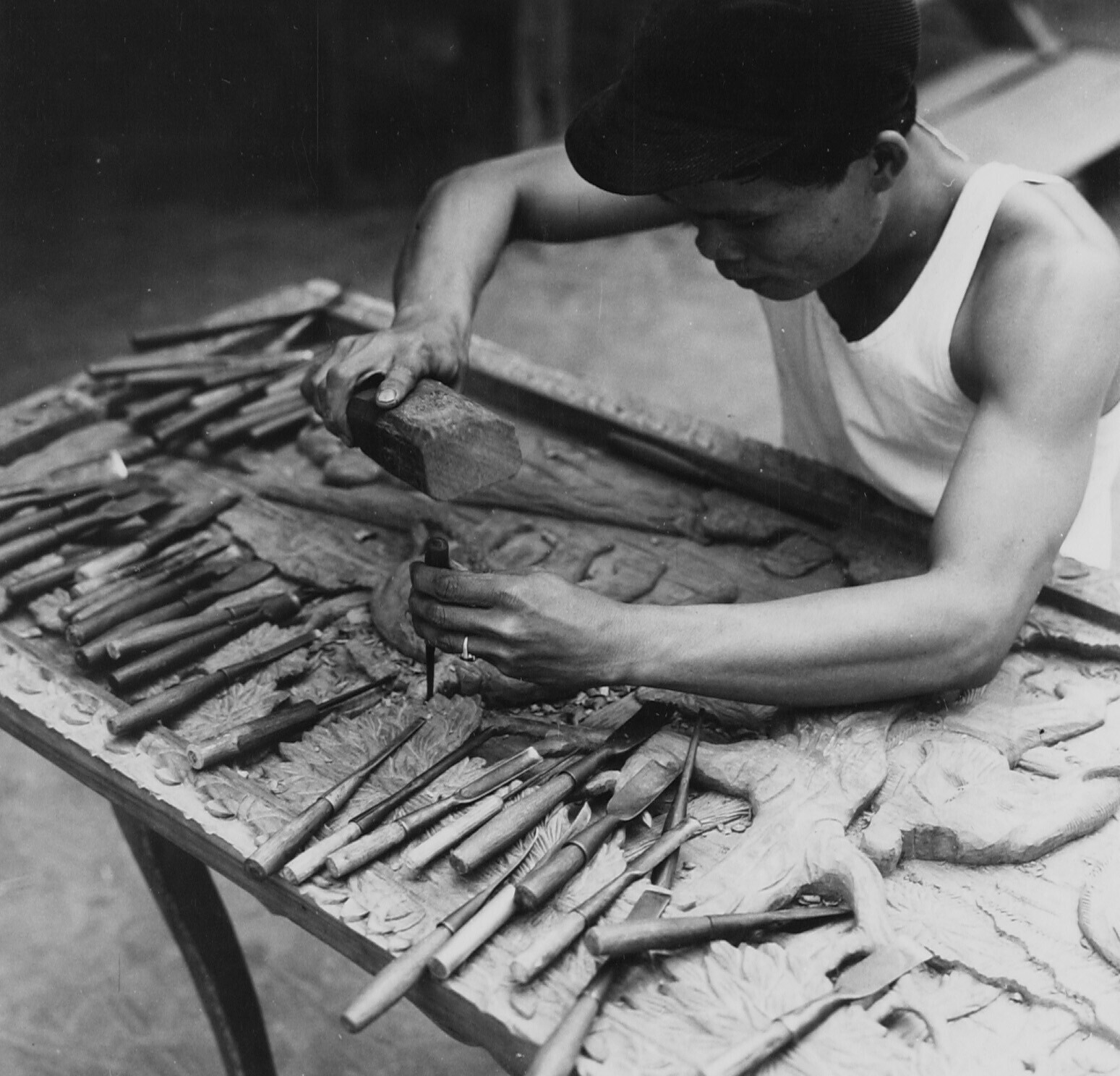 Een houtsnijder beitelt een voorstelling in een teak...