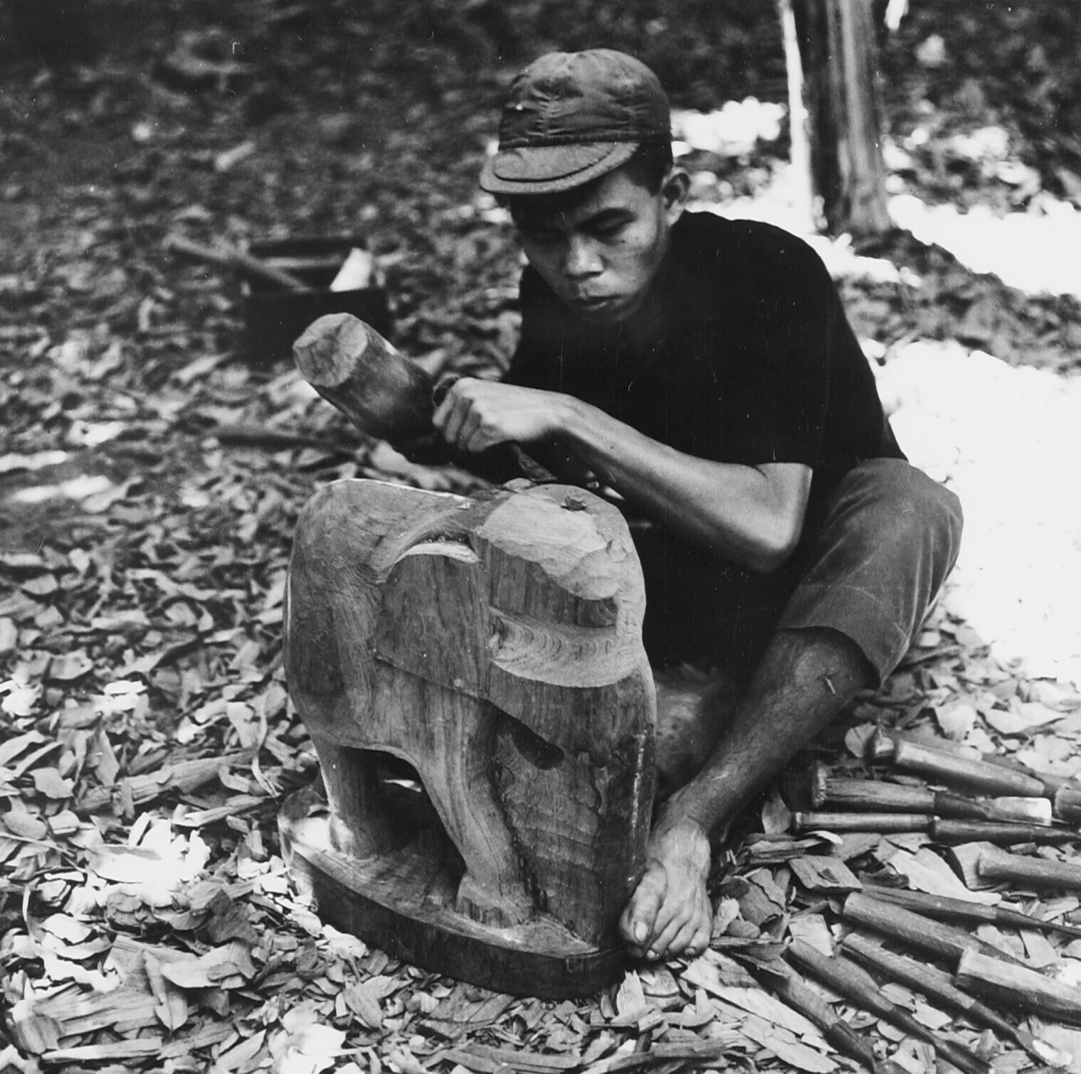 Een houtsnijder vervaardigt uit een blok teakhout ee...