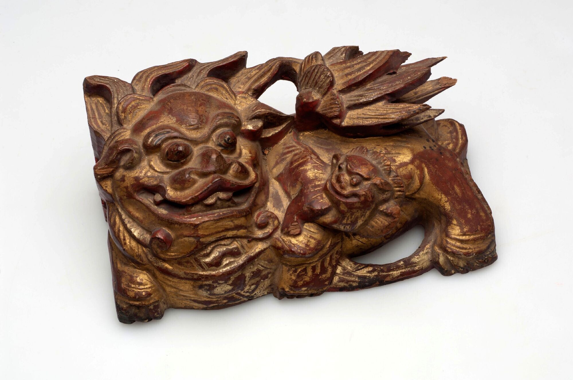 Houten ornament i.d. vorm v.e. leeuw, ornament v.e. ...