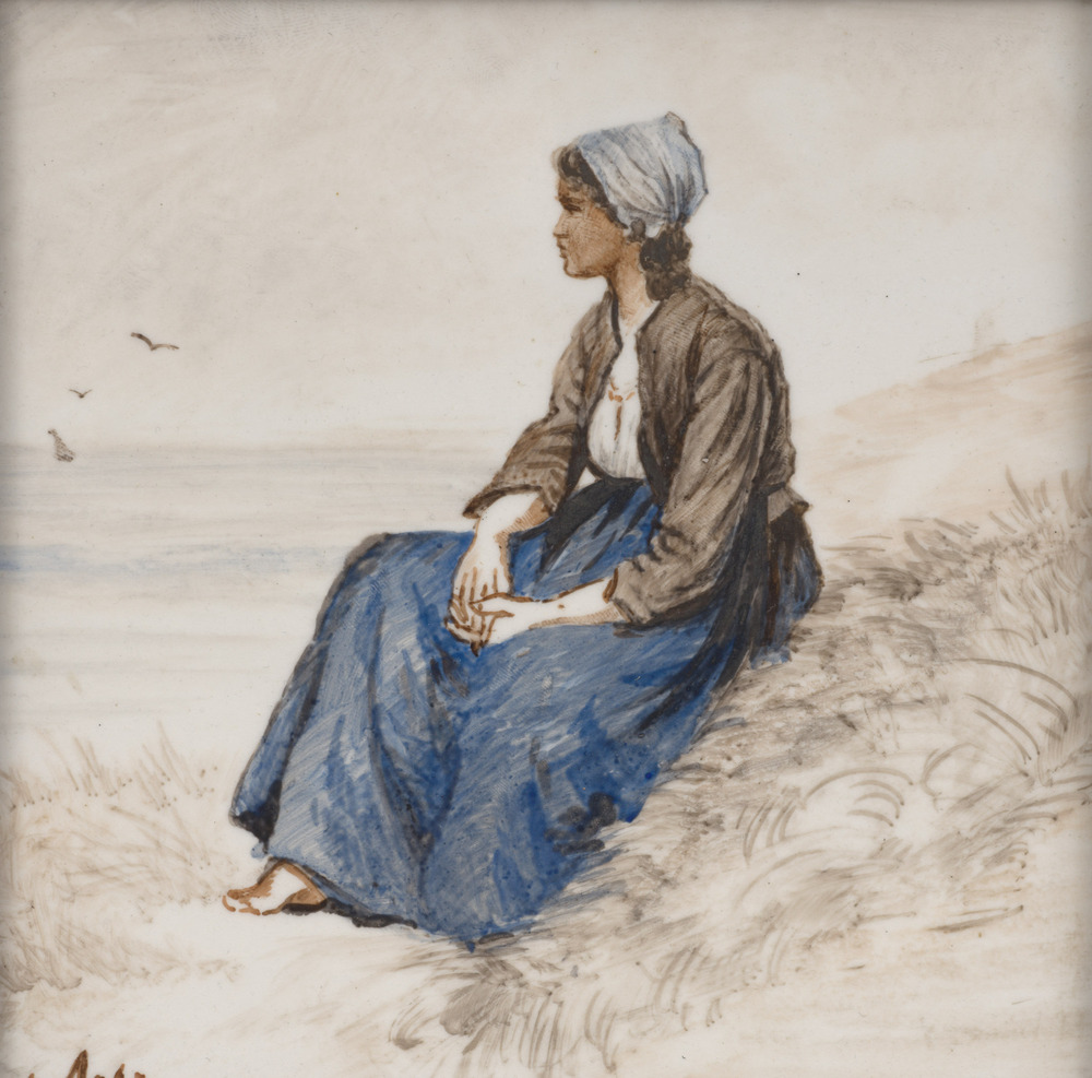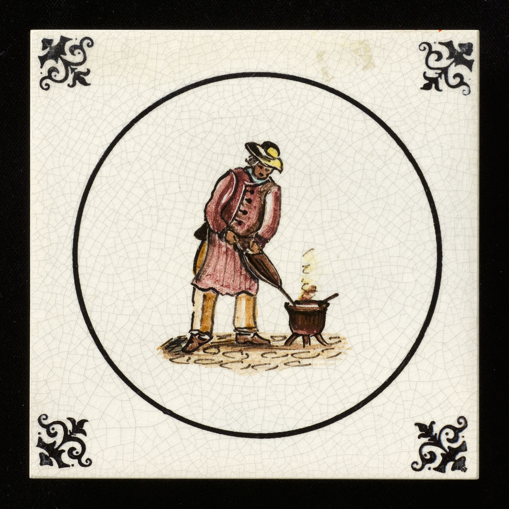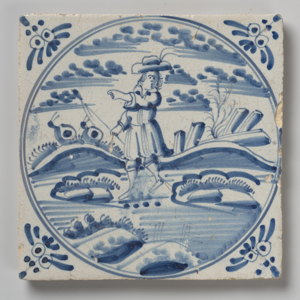 Tegel van keramiek met tinglazuur, voorstellende: De...
