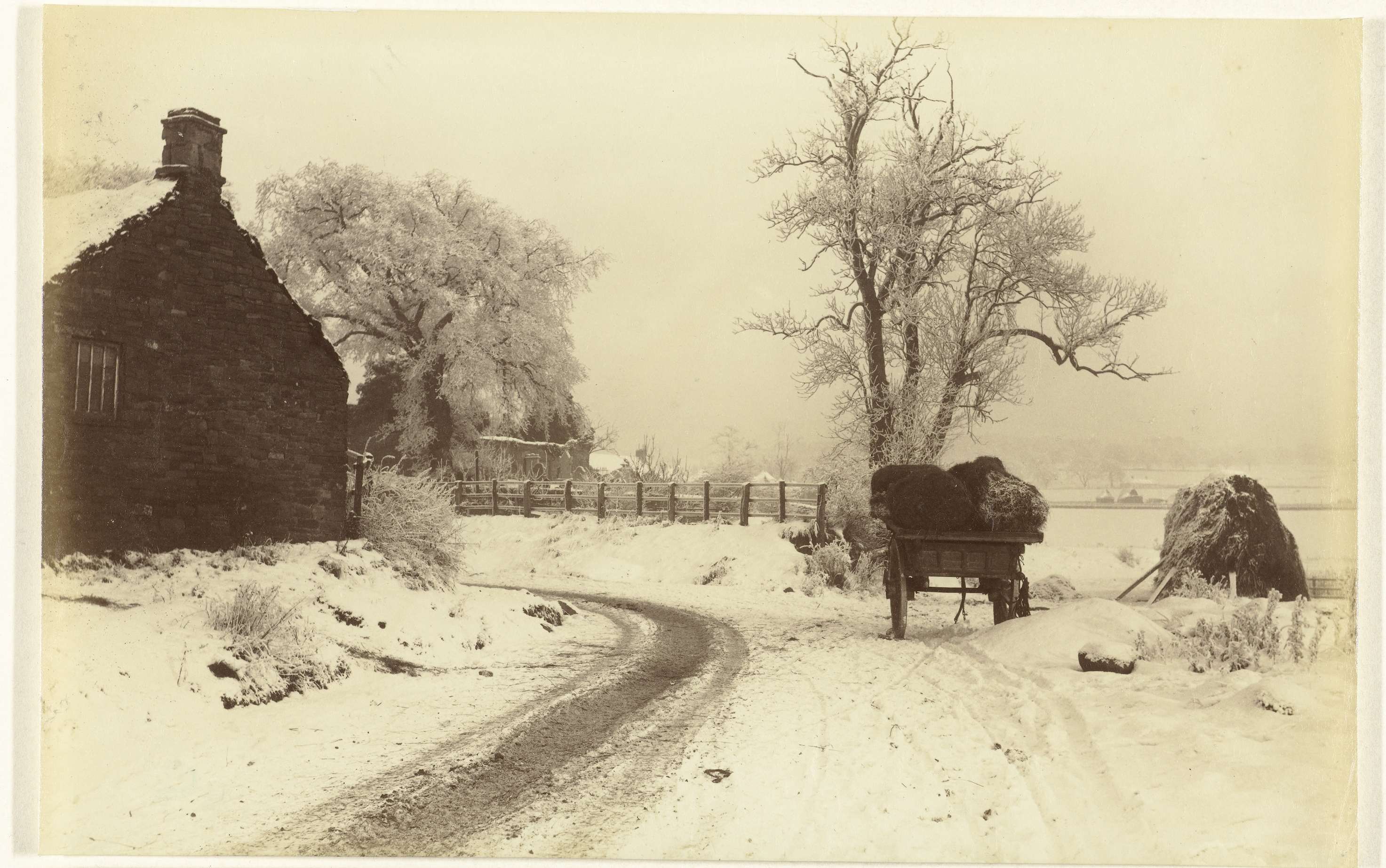 Winterlandschap met sneeuw en hooiwagen
