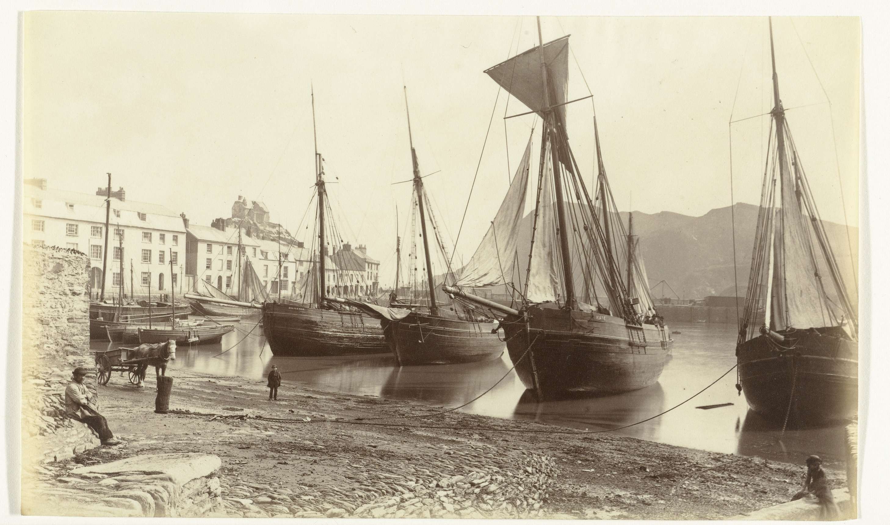 Gezicht op Conwy Castle met schepen op de voorgrond