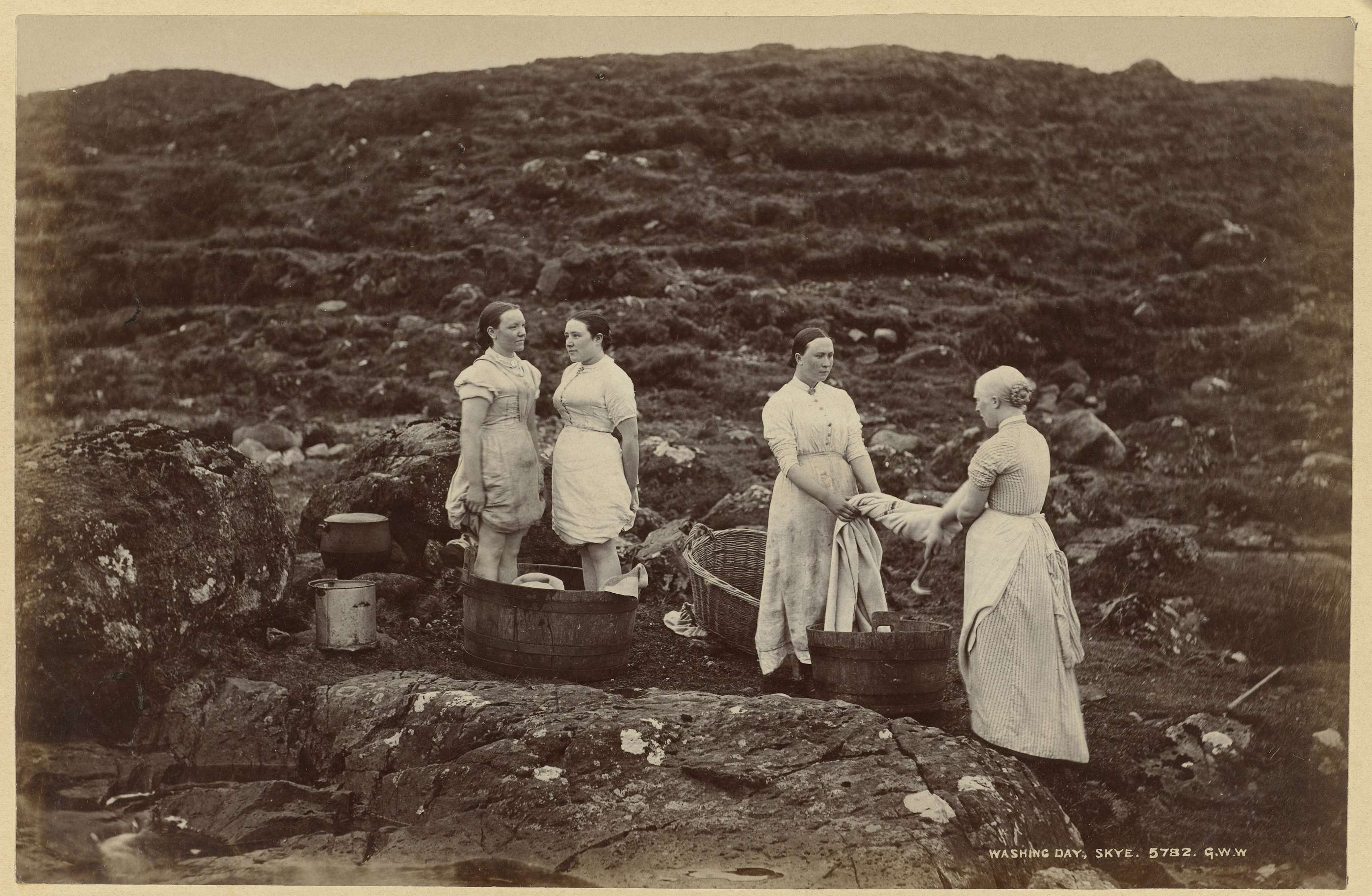 Vier onbekende vrouwen met tobbes en wasgoed op Skye