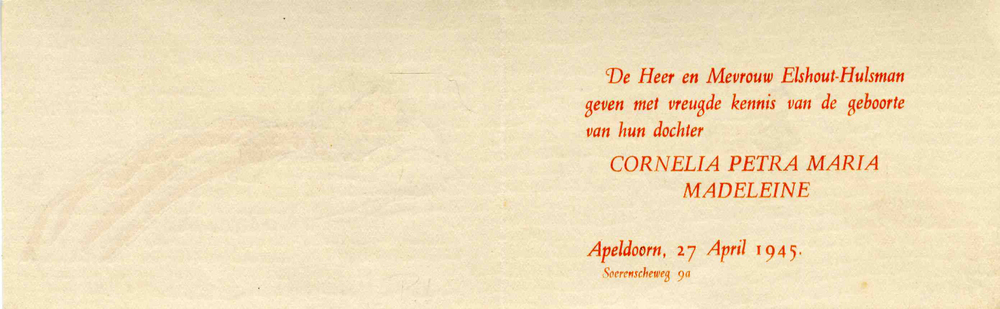 geboortekaartje Cornelia P.M.M. Elshout 27 april 1945