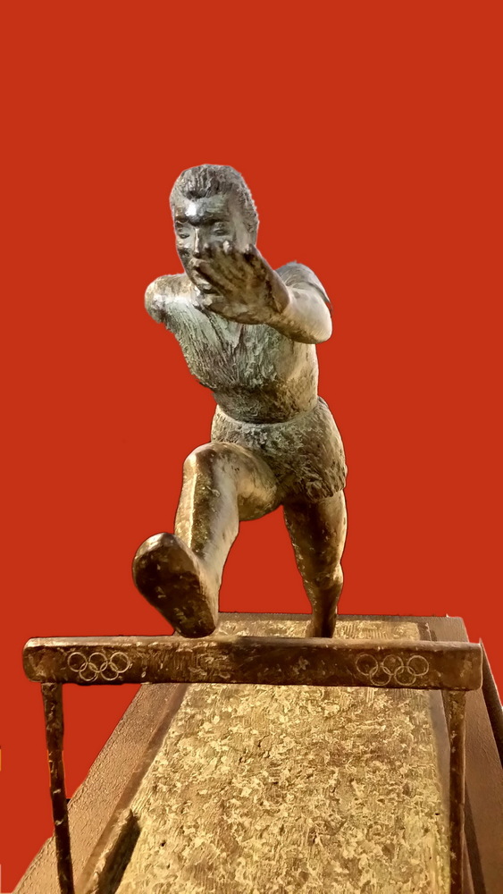 Beeld hordeloopster Fanny Blankers-Koen met namenpla...