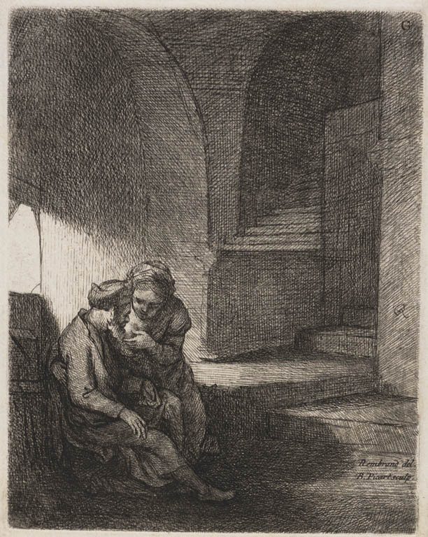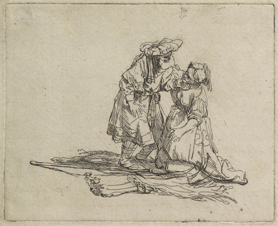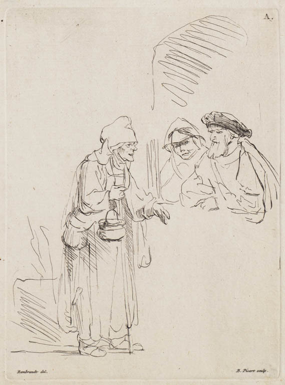Wandelaarster bij deuropening waarin man en vrouw le...