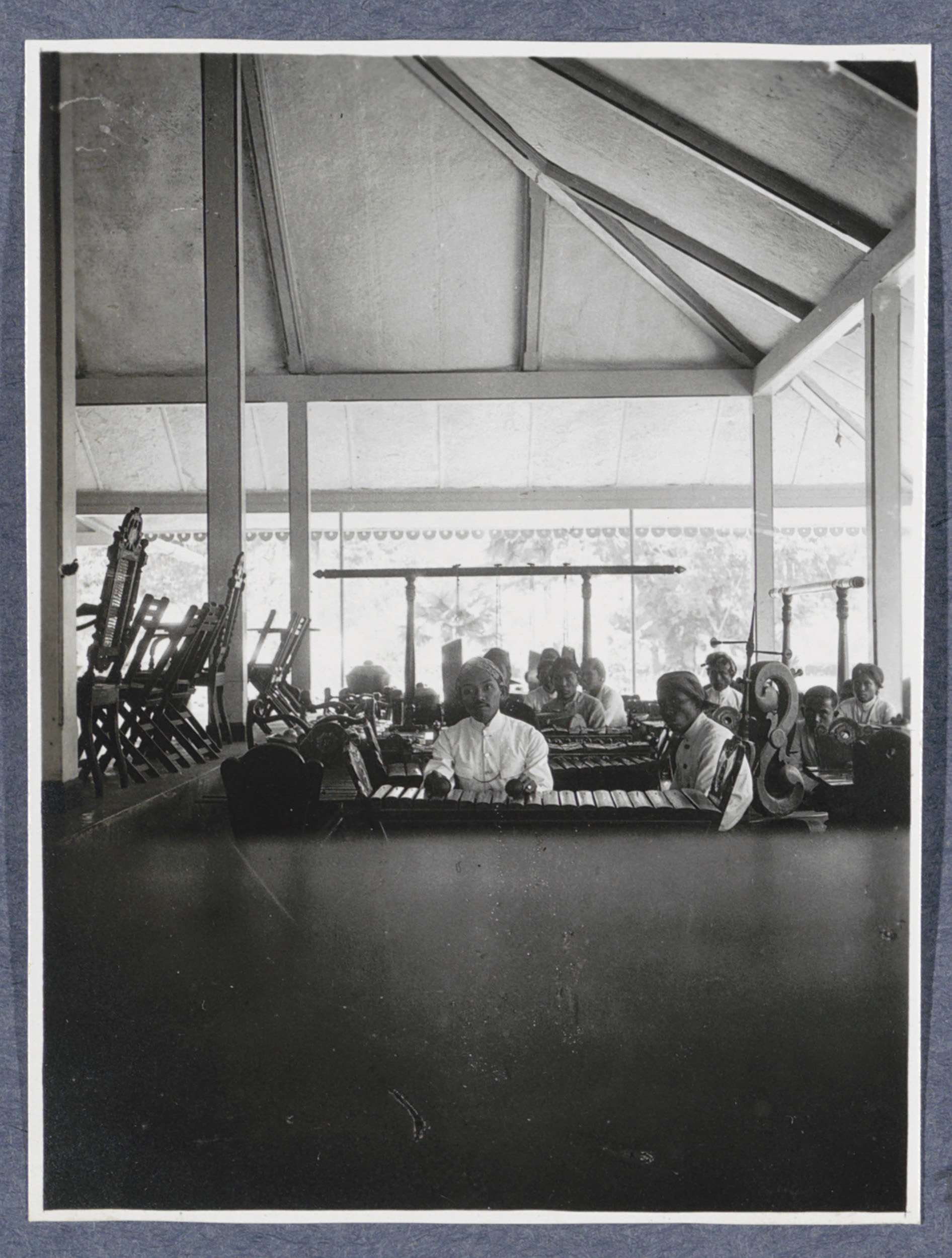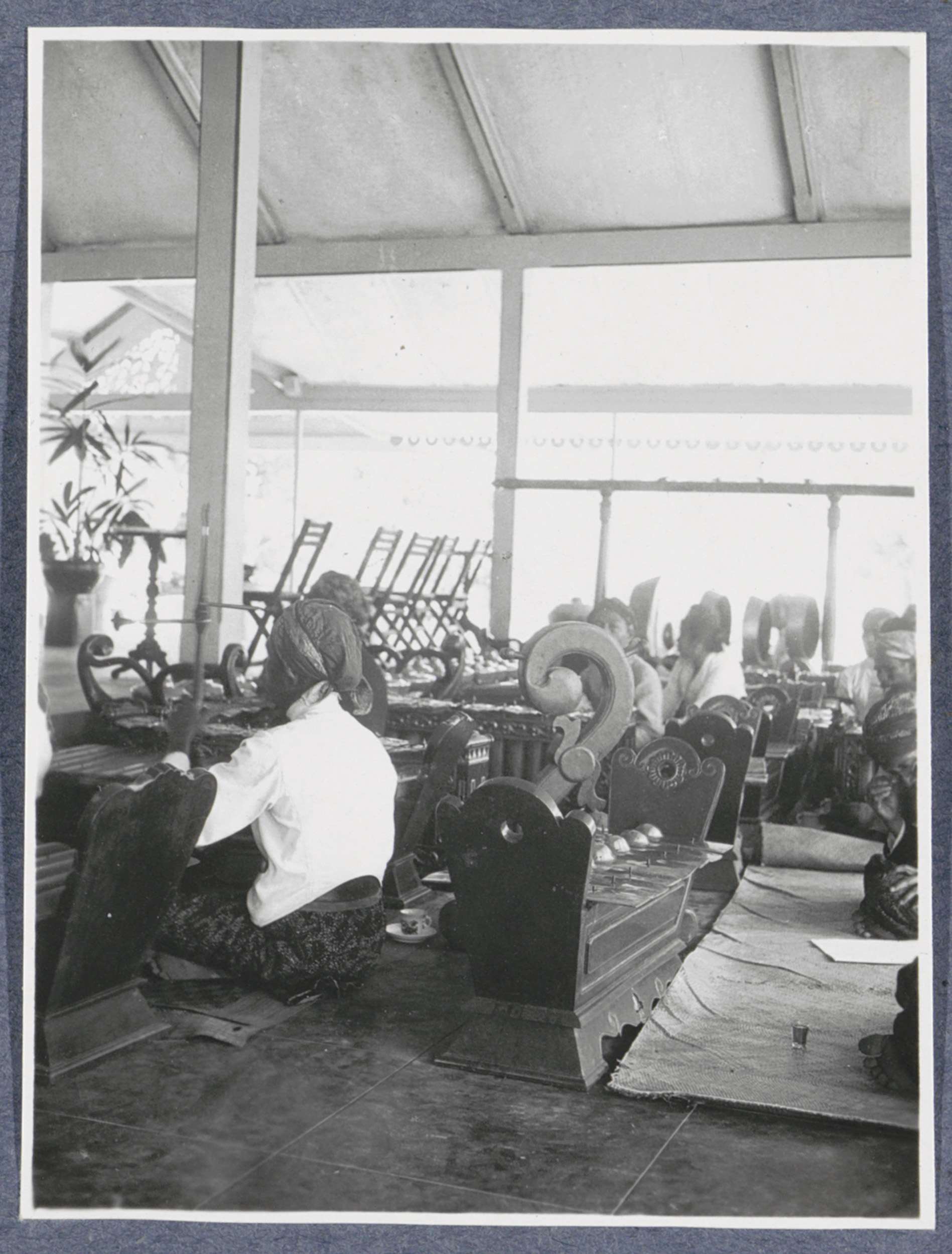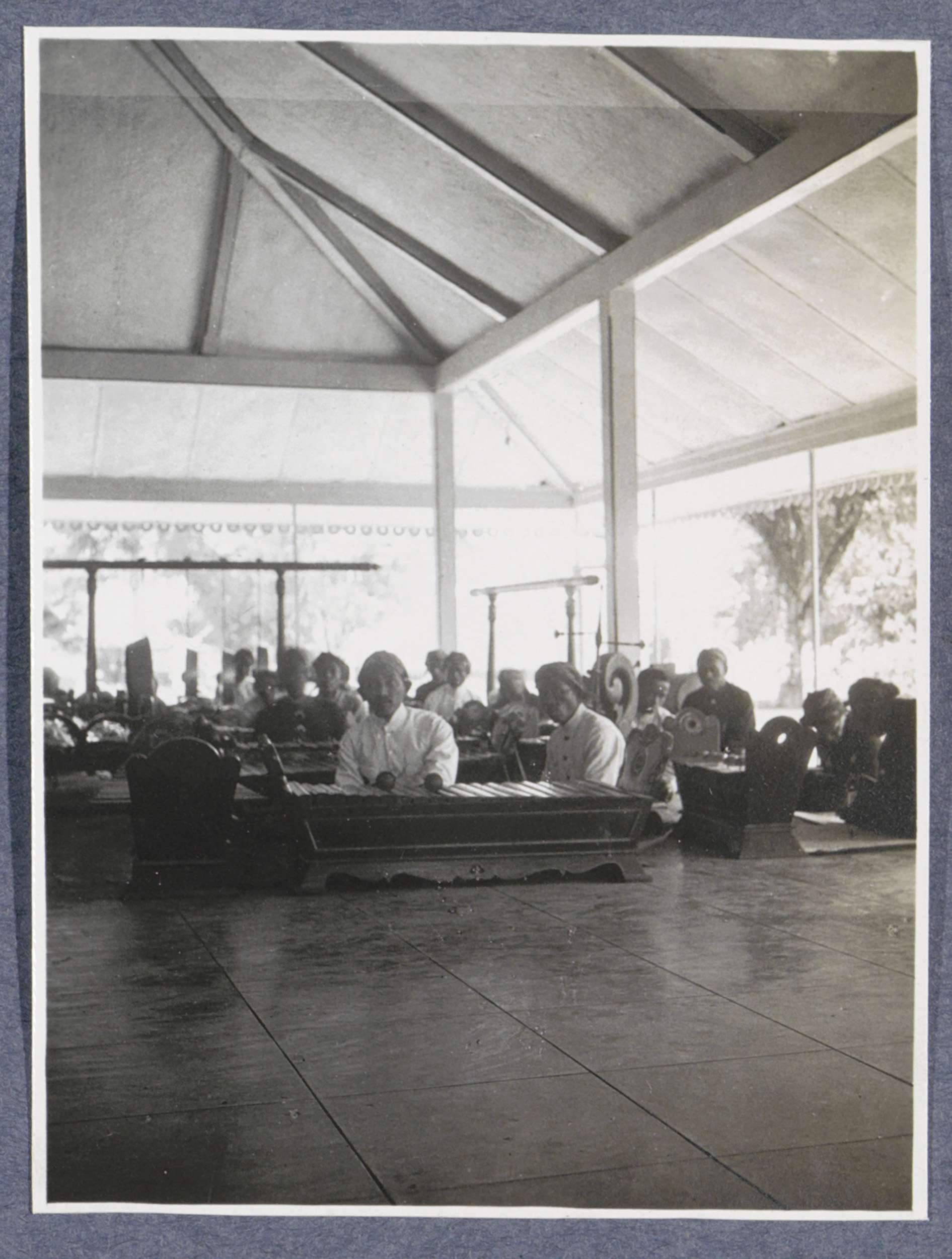 Gamelanorkest spelend tijdens bezoek van Europeanen ...