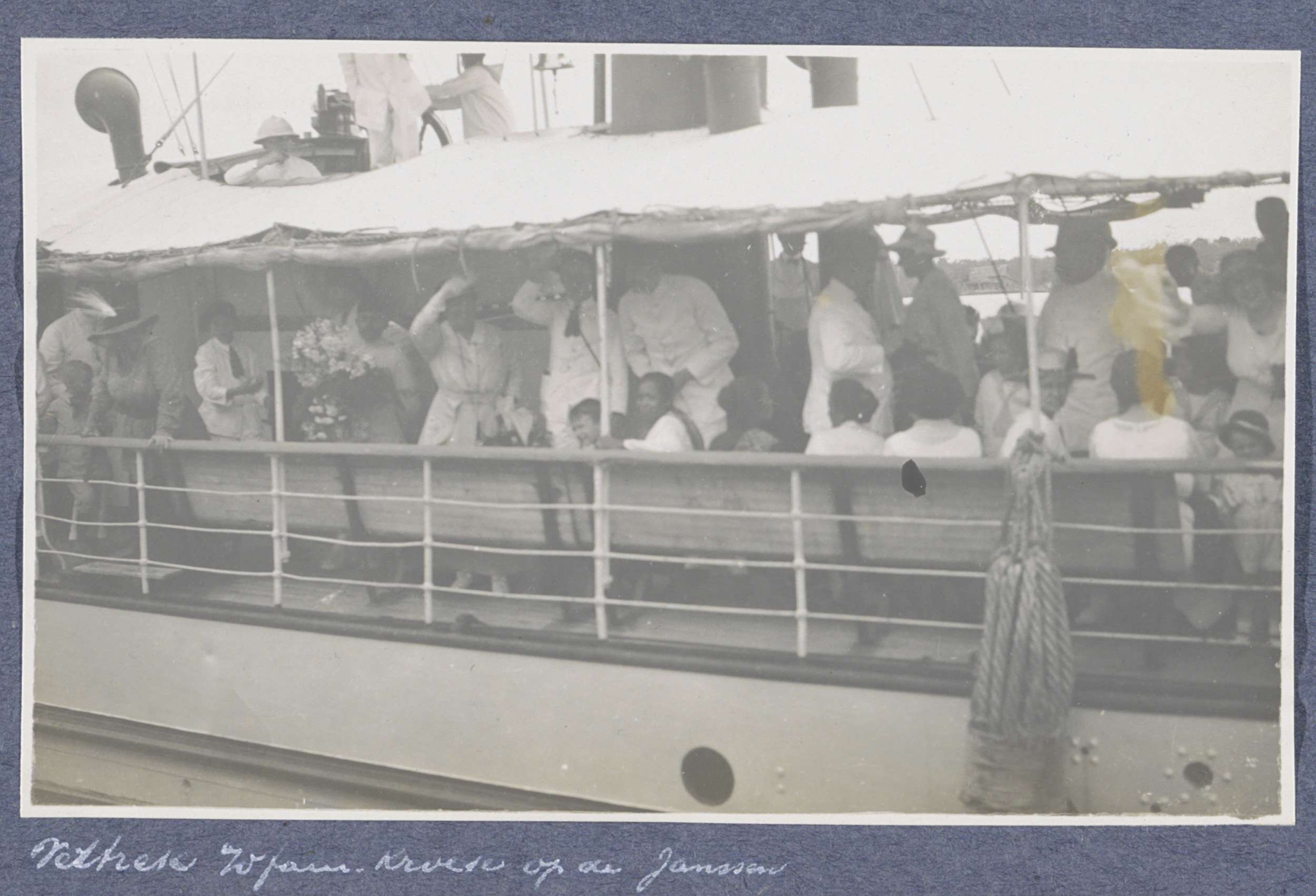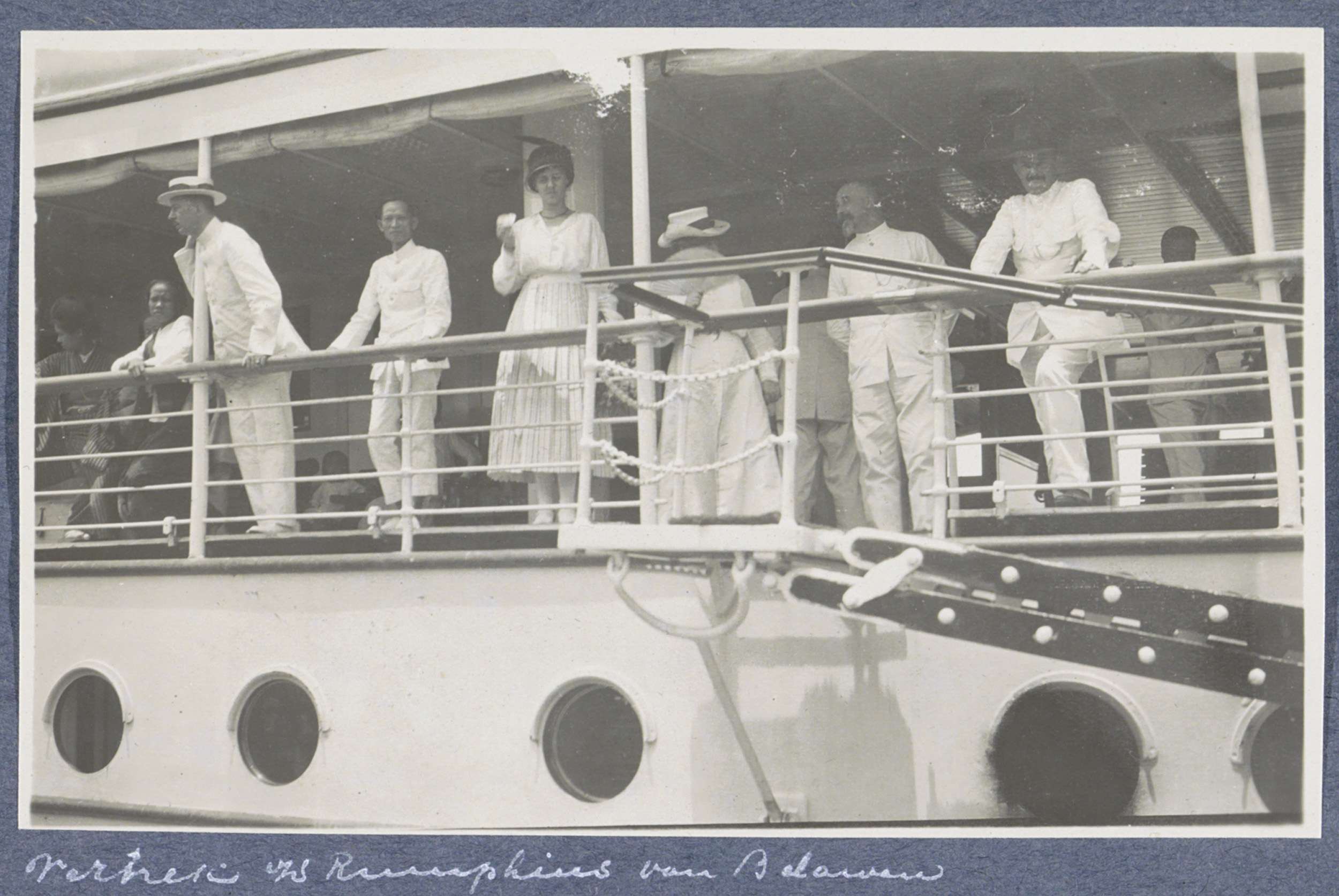 Passagiers aan boord van ss. Rumphius bij vertrek ui...