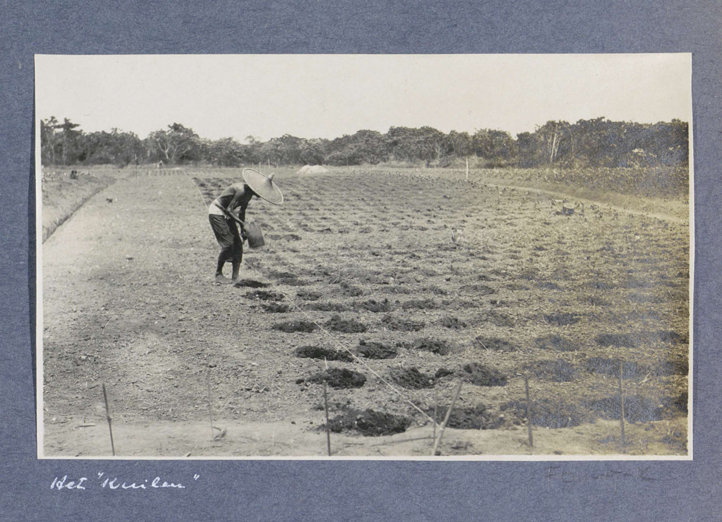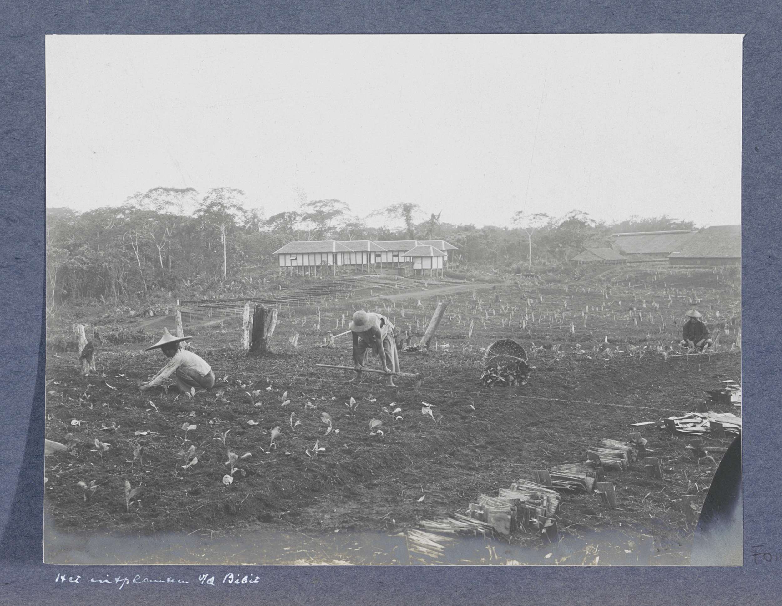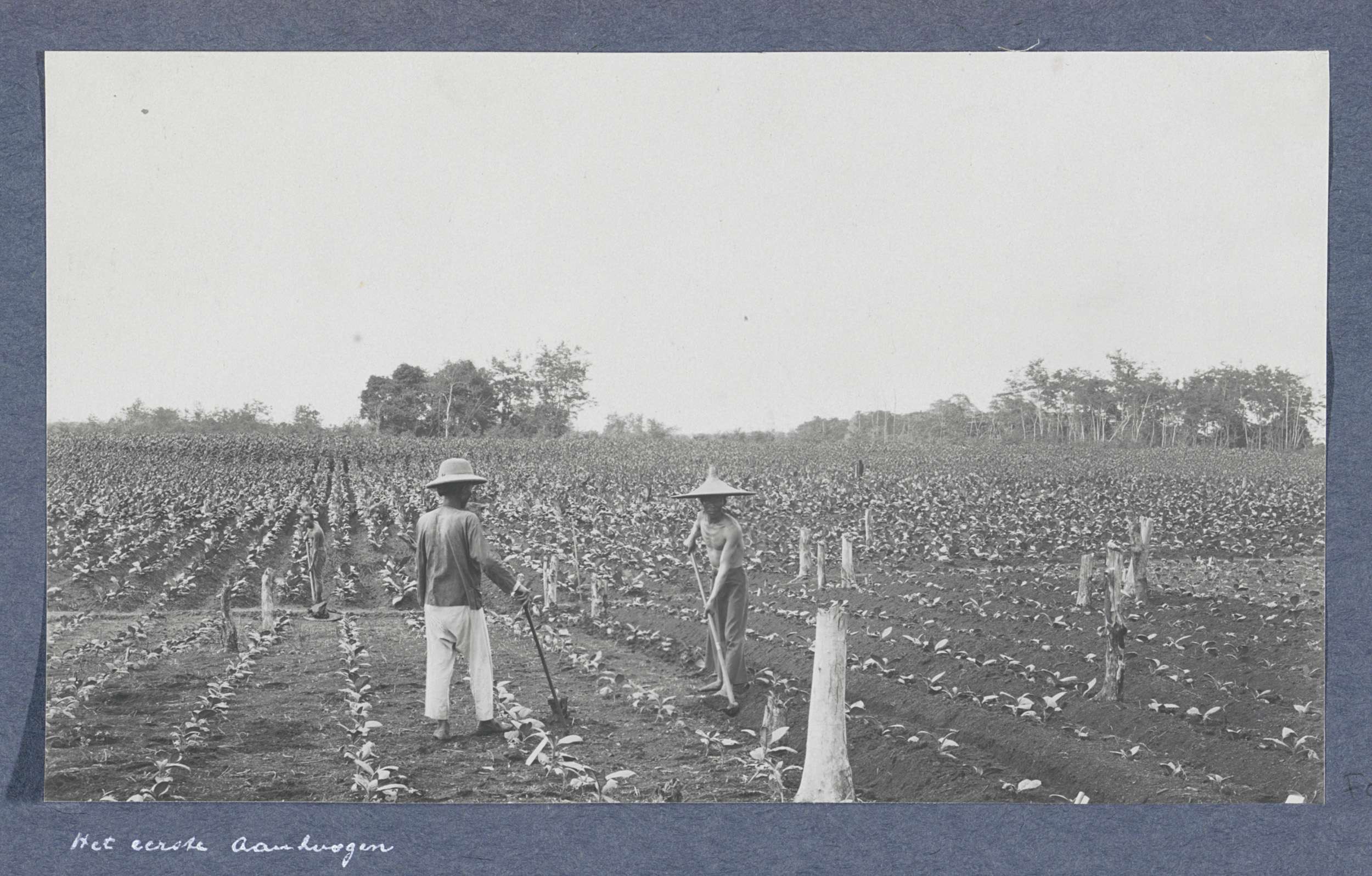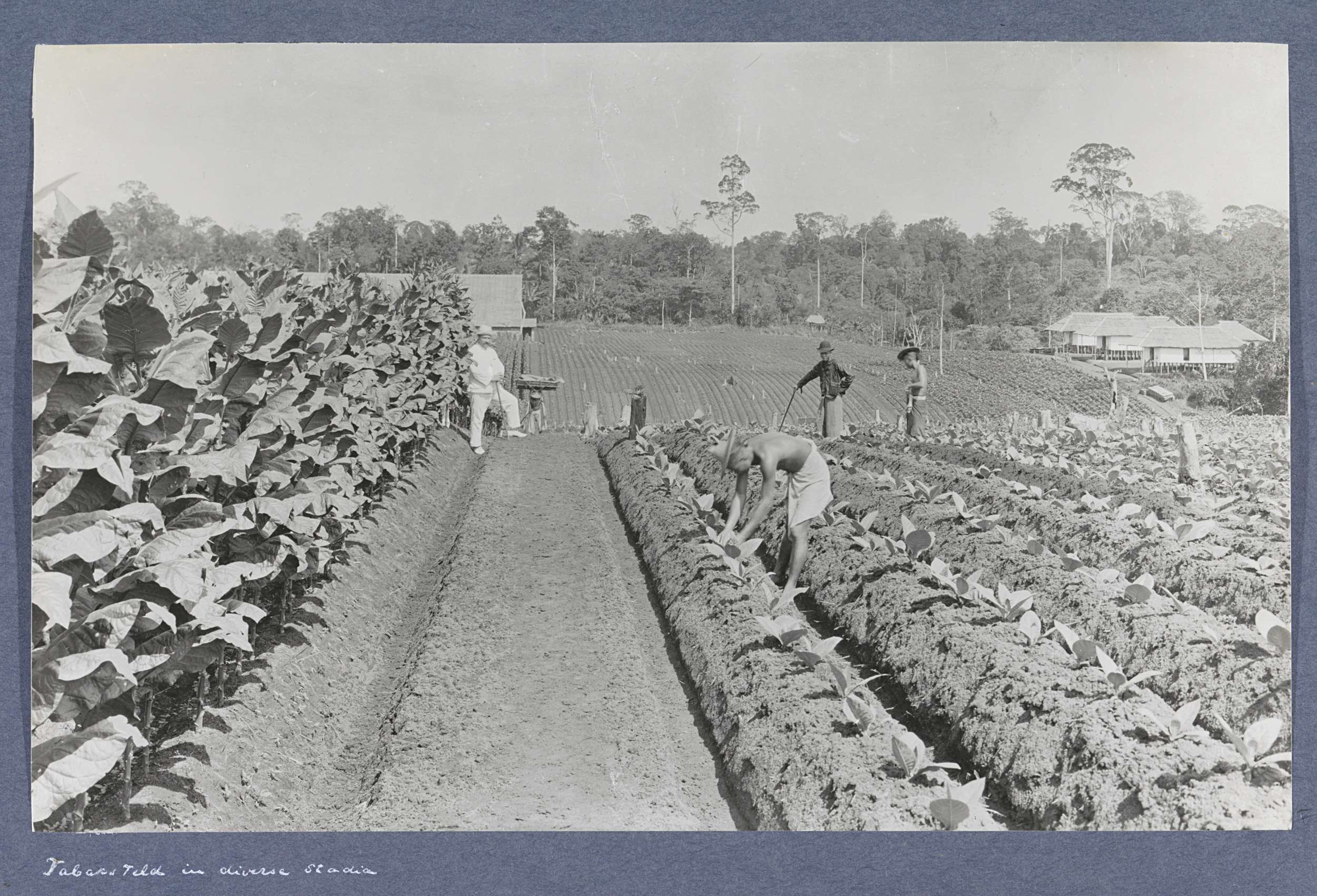 Mannen werkend in tabaksbedden op Sumatra, links een...