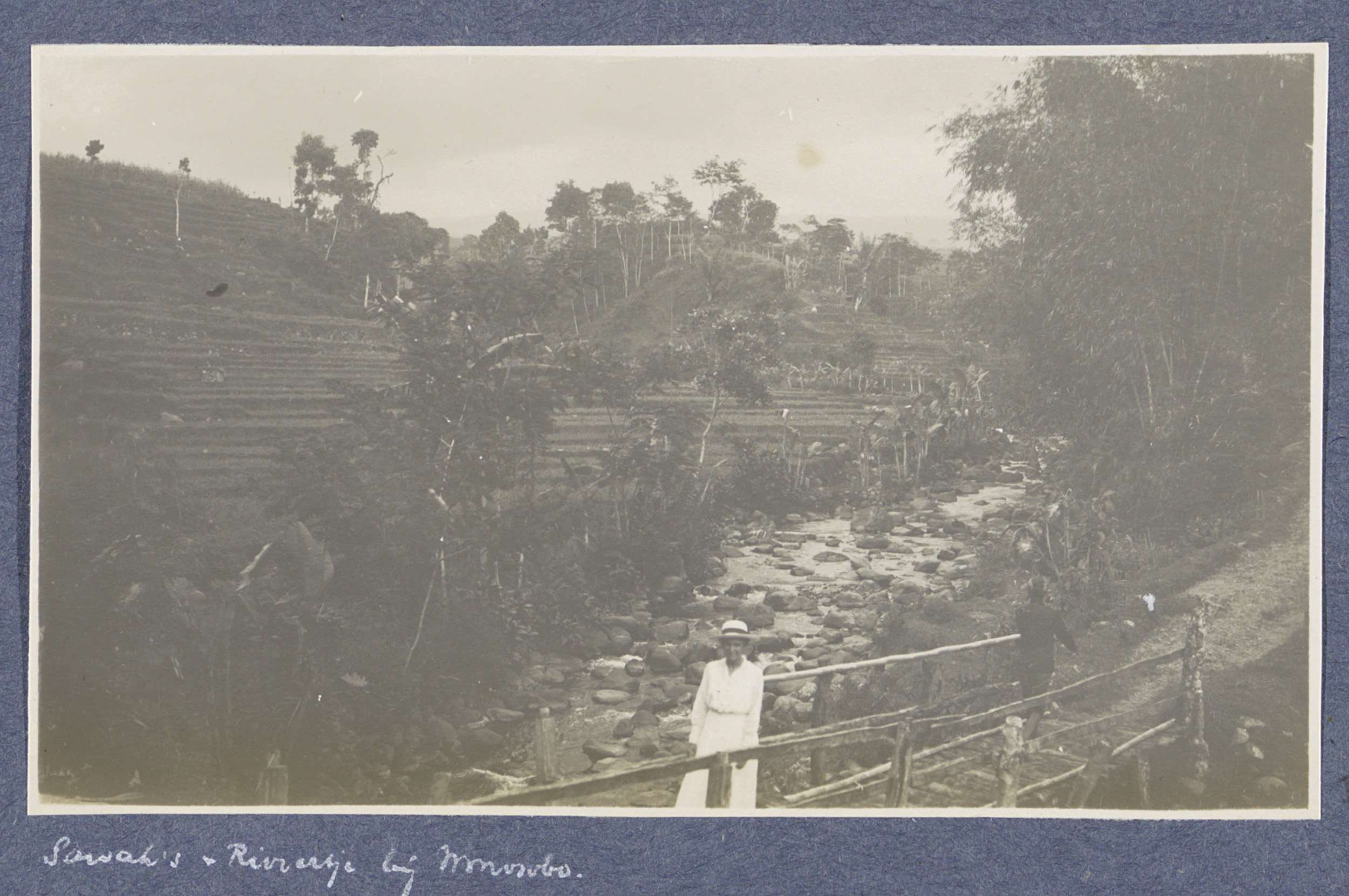 Twee personen op een brug over een rivier bij Wonoso...