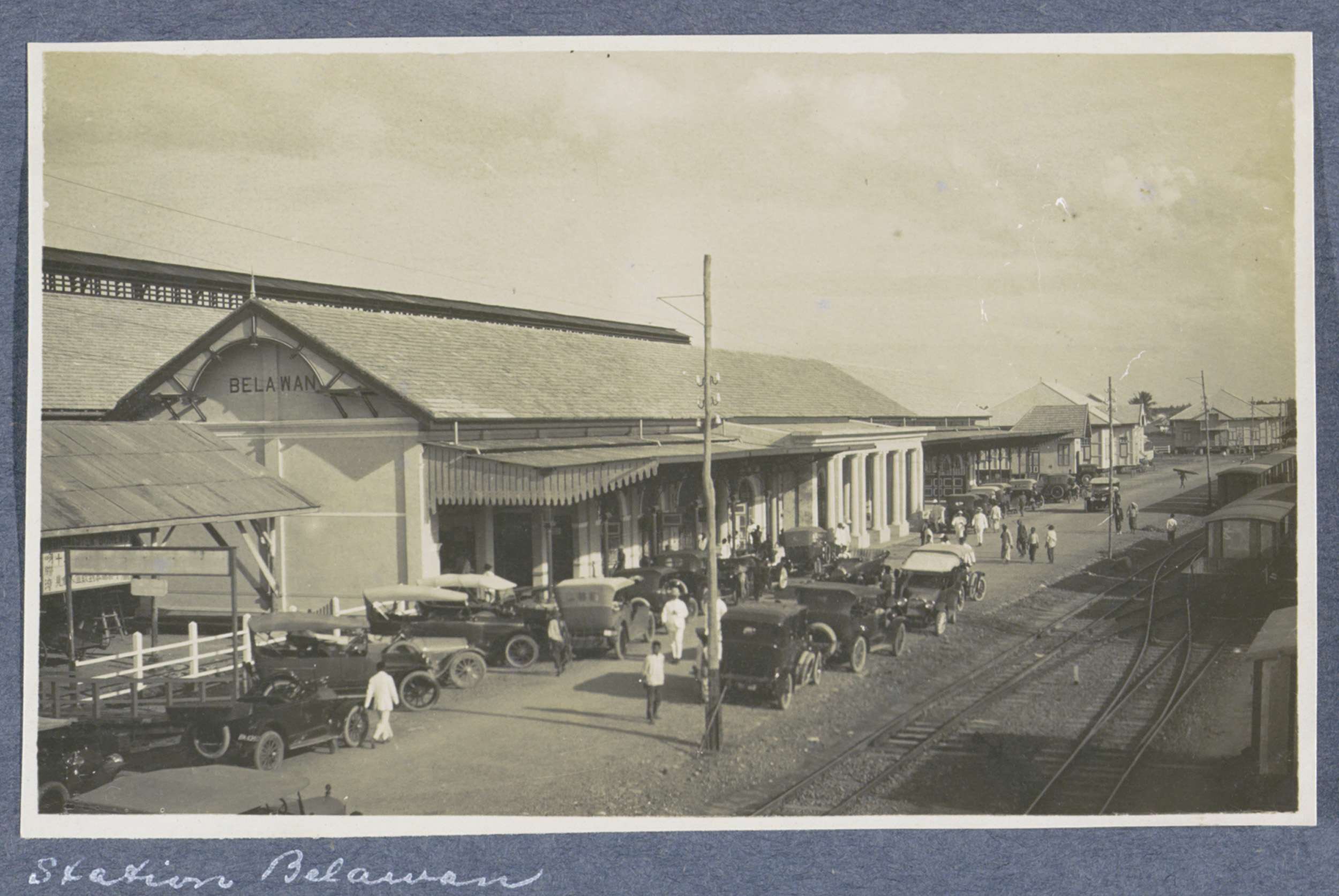 Auto's voor het spoorwegstation van Belawan op Sumatra
