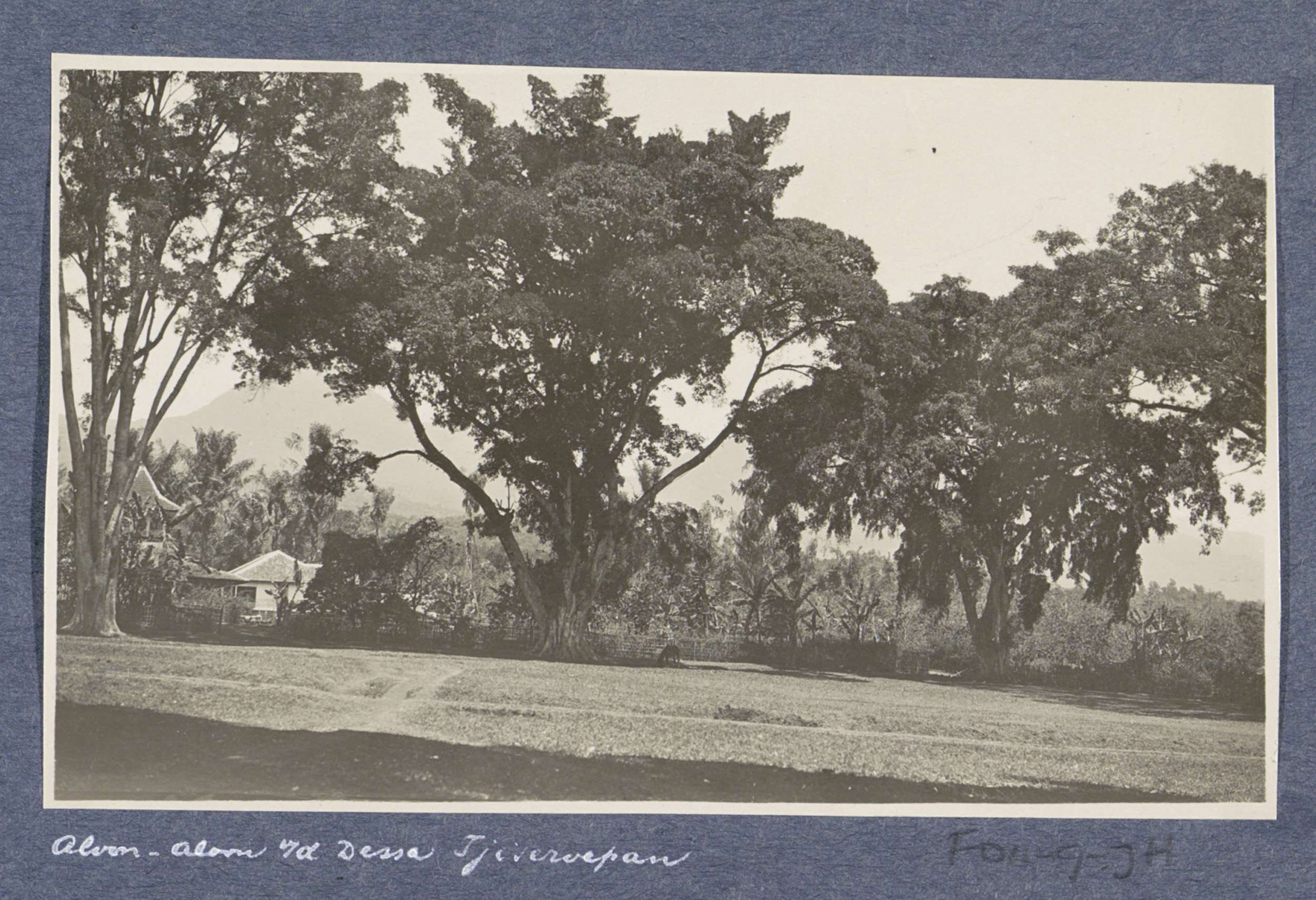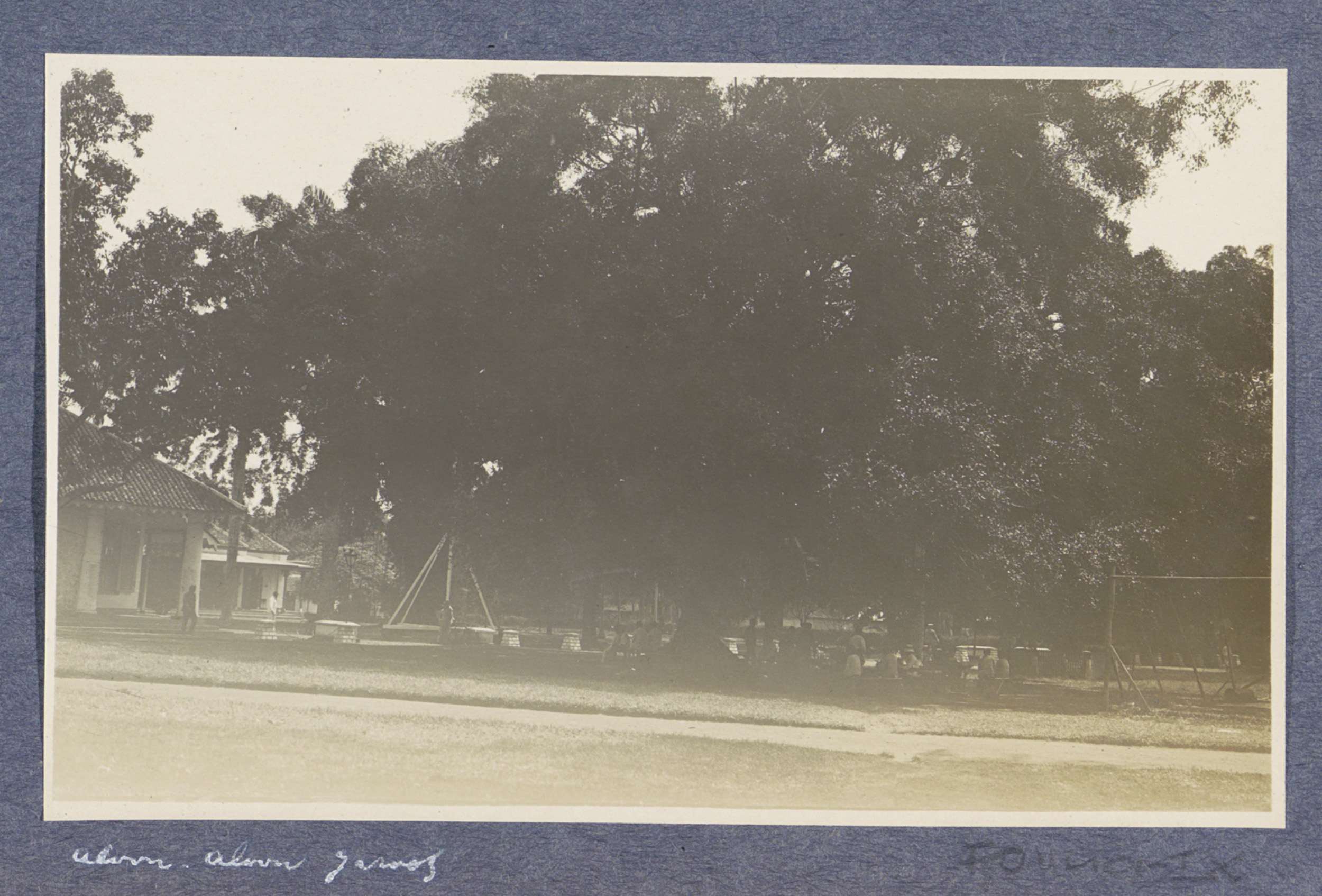 Grasveld (alun-alun) met bomen in Tjisoeroepan op Java