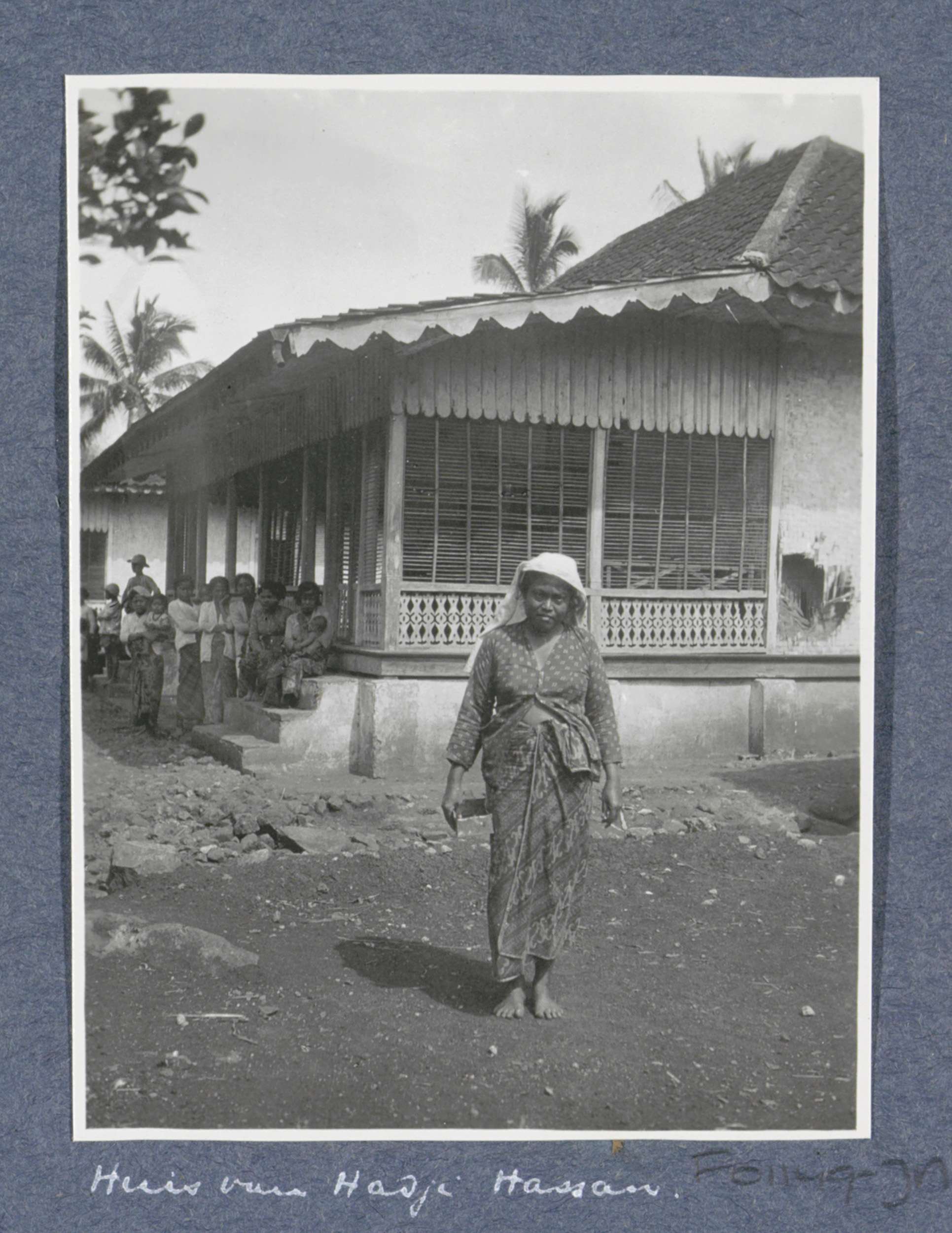 Dochter van Hadji Hassan poserend voor zijn huis, ve...