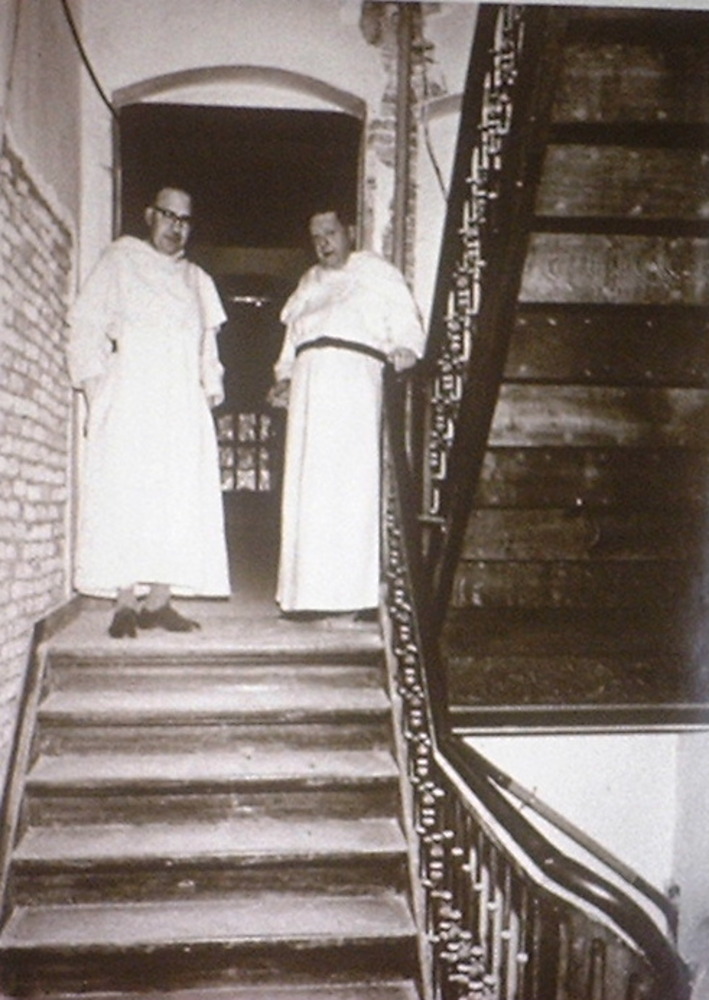 Twee pater Dominicanen in het klooster op de trap