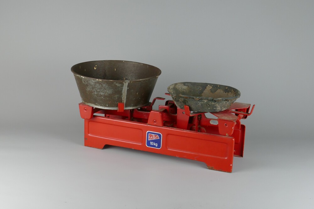 weegschaal met 2 schalen van het merk Rhewa, circa 1950