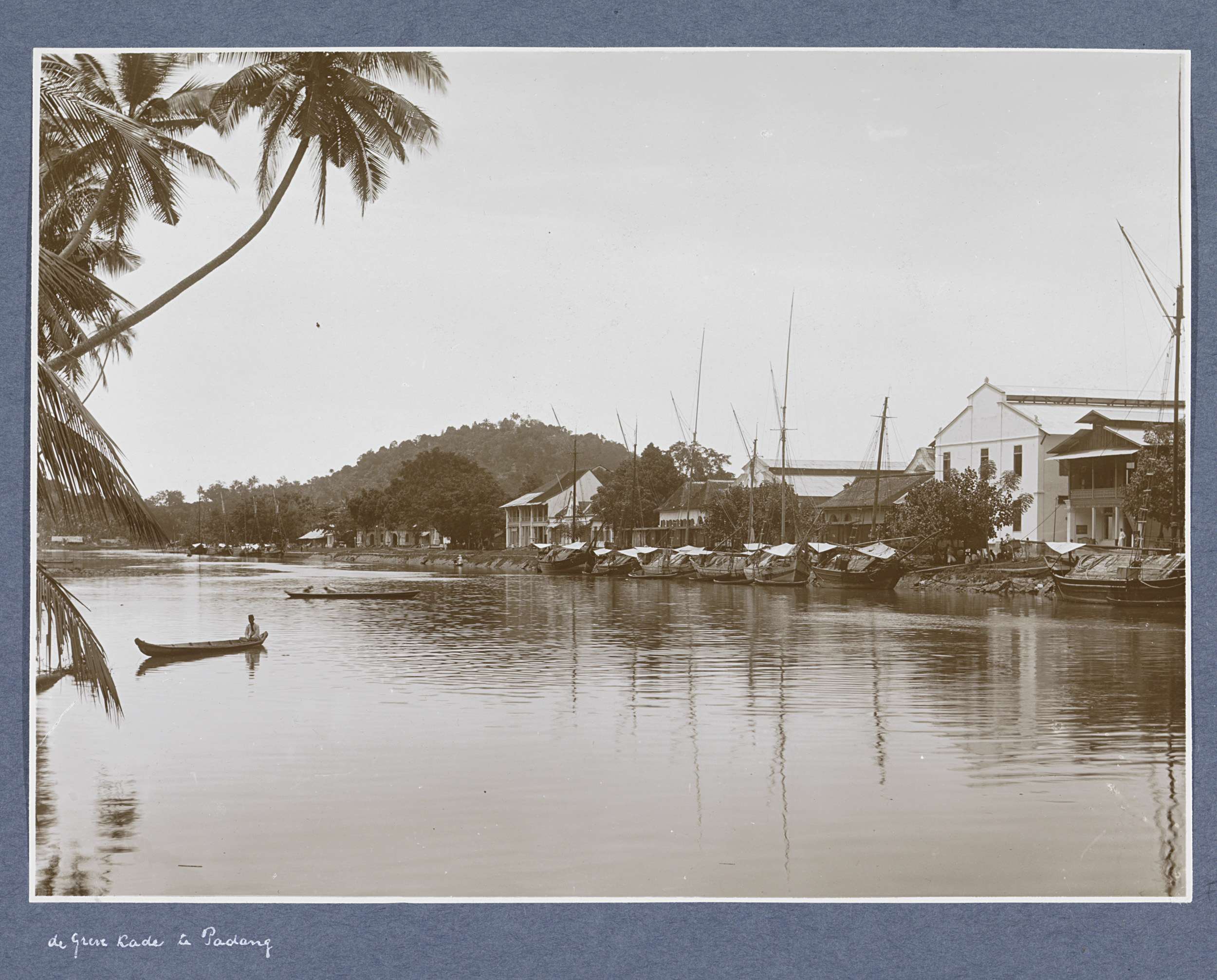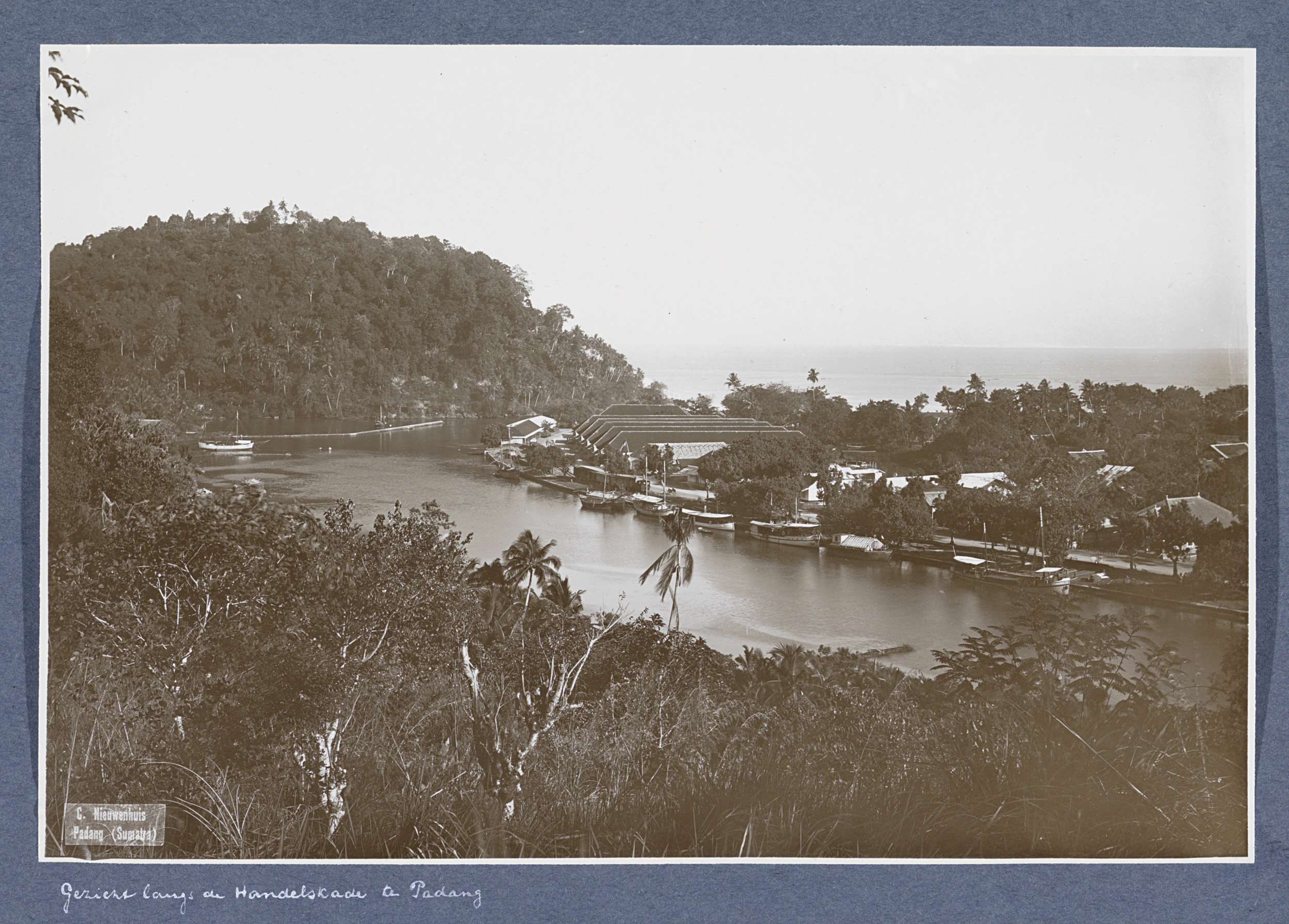 Gezicht op de Handelskade in Padang met schepen, loo...