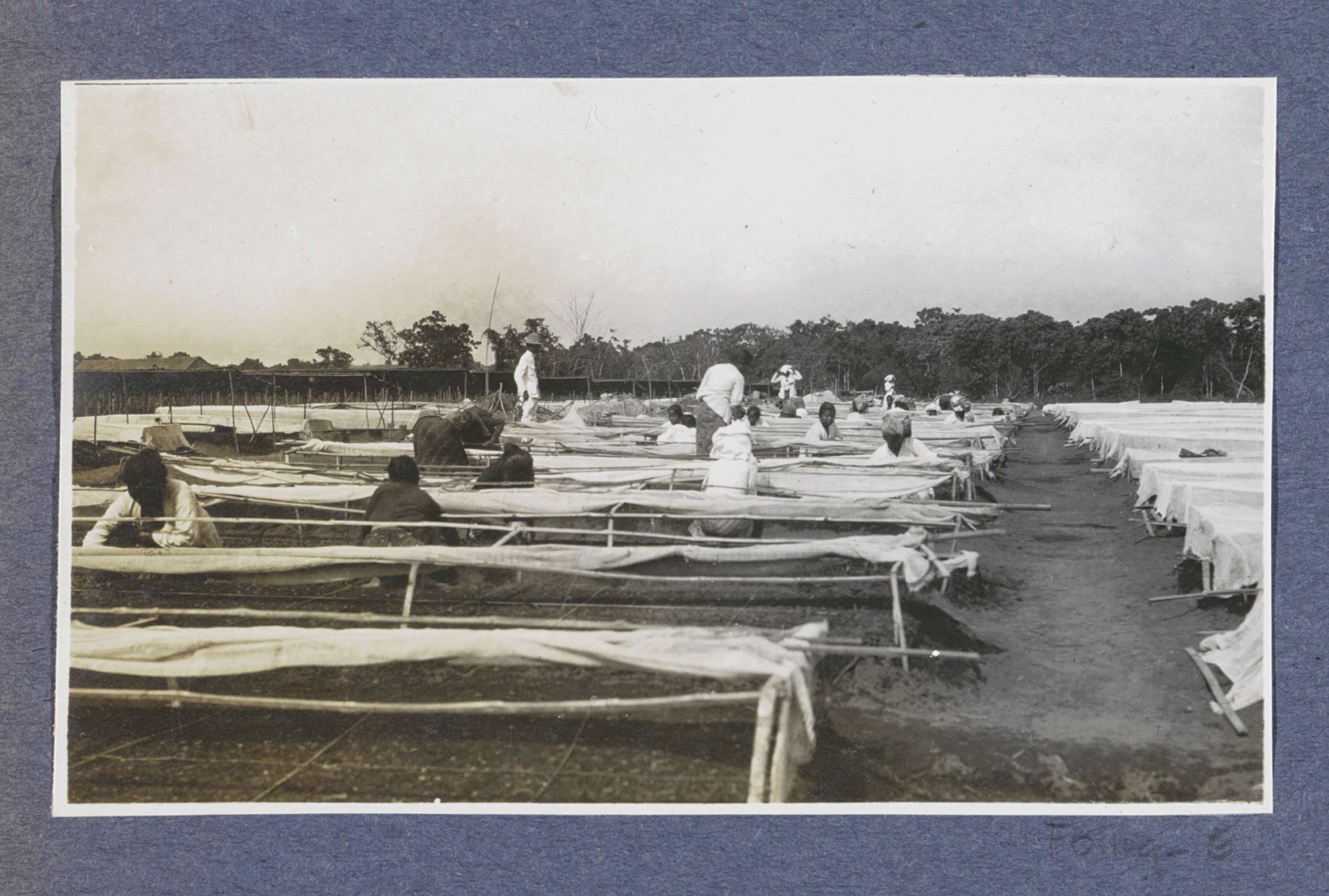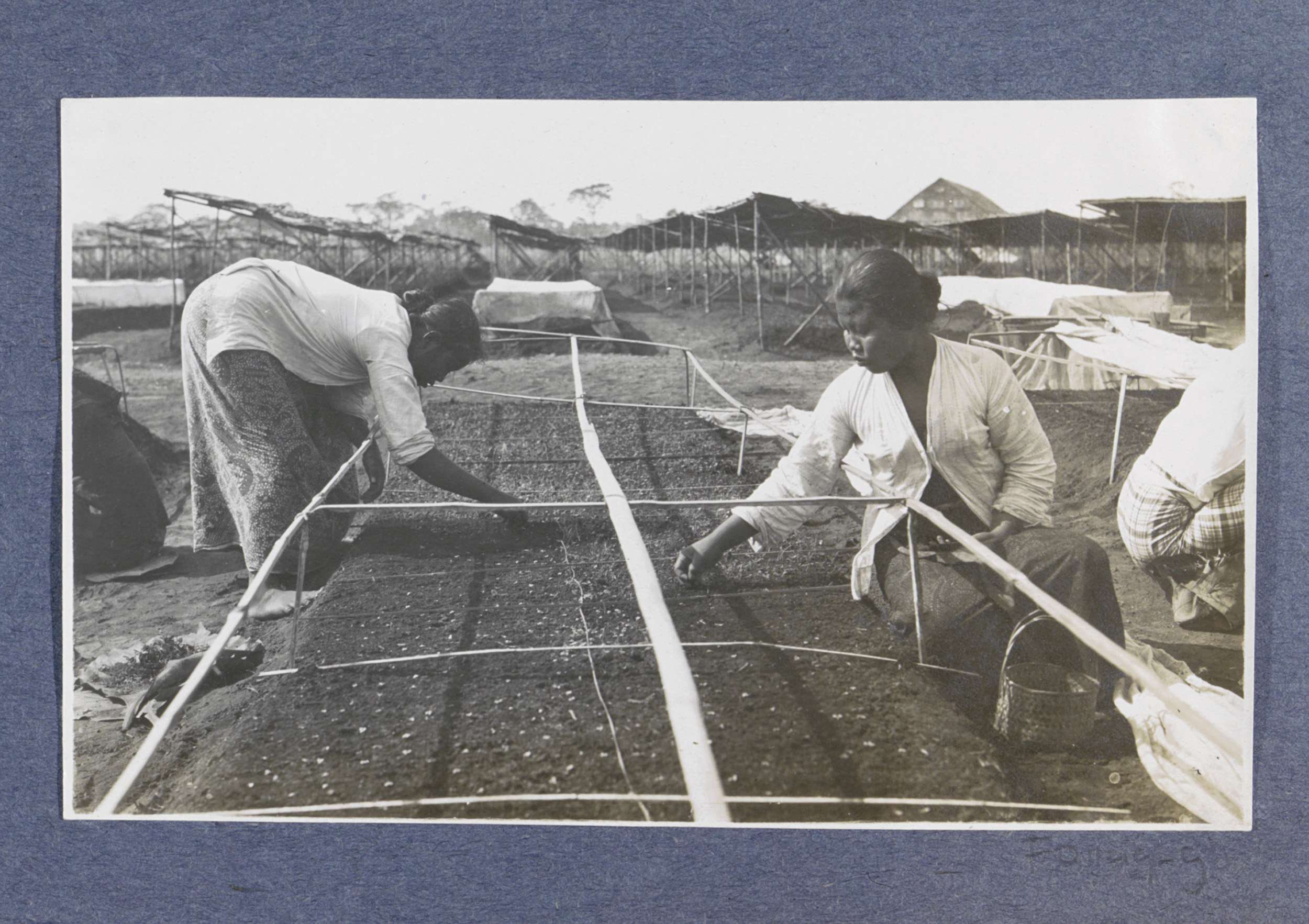 Arbeiders aan het werk bij zaadbedden onder klamboes...