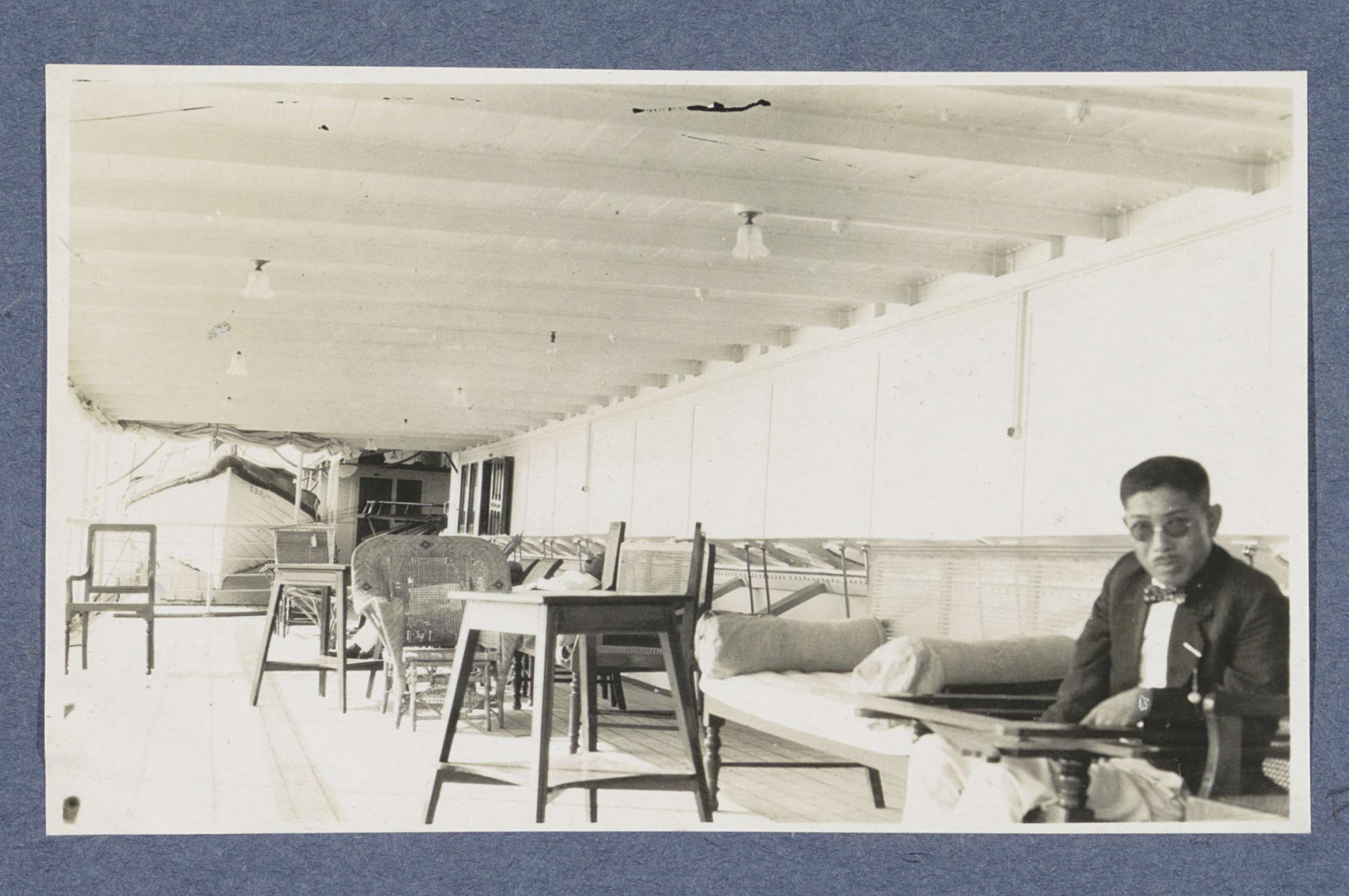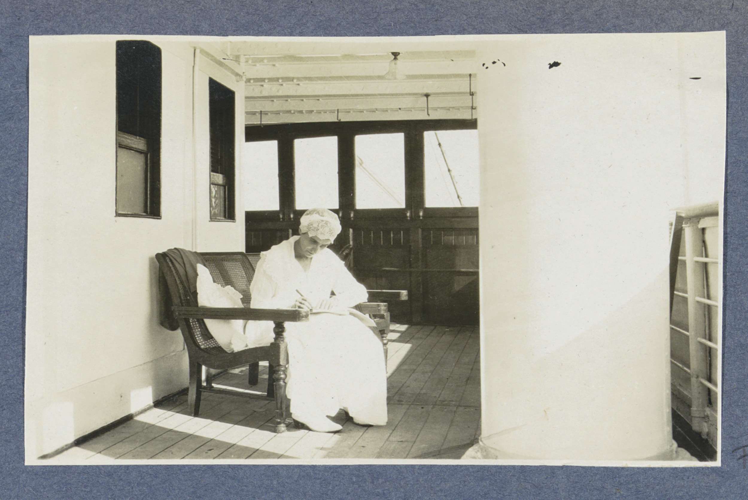 Schrijvende vrouw aan boord van passagiersschip ss. ...