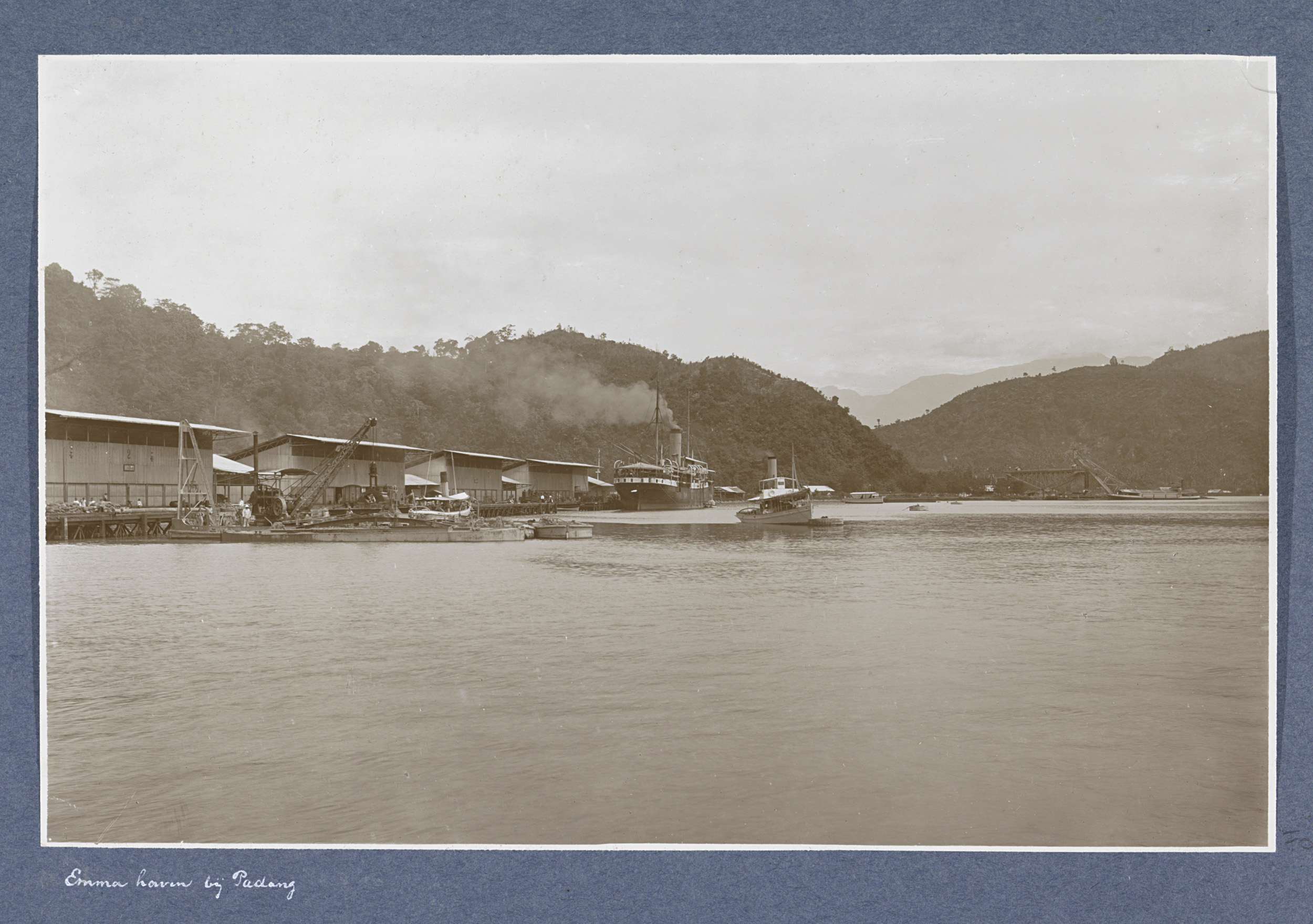 Gezicht op de Emmahaven in Padang met schepen, loods...