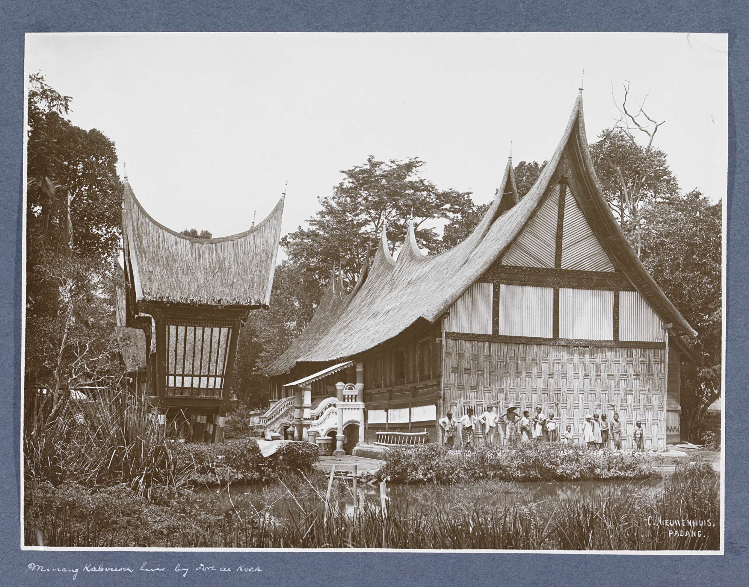 Kinderen poserend voor een woonhuis in Minangkabou o...